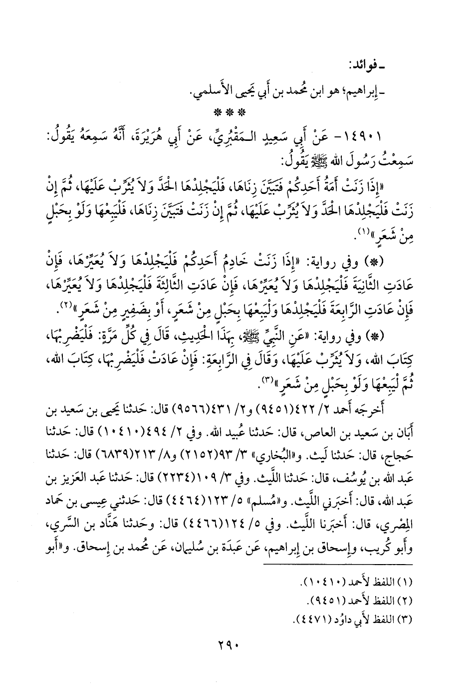 - وفي رواية: «إذا زنت خادم أحدكم فليجلدها ولا يعيرها، فإن عادت الثانية فليجلدها ولا يعيرها، فإن عادت الثالثة فليجلدها ولا يعيرها، فإن عادت الرابعة فليجلدها وليبعها بحبل من شعر، أو بضفير من شعر» (¬٢).