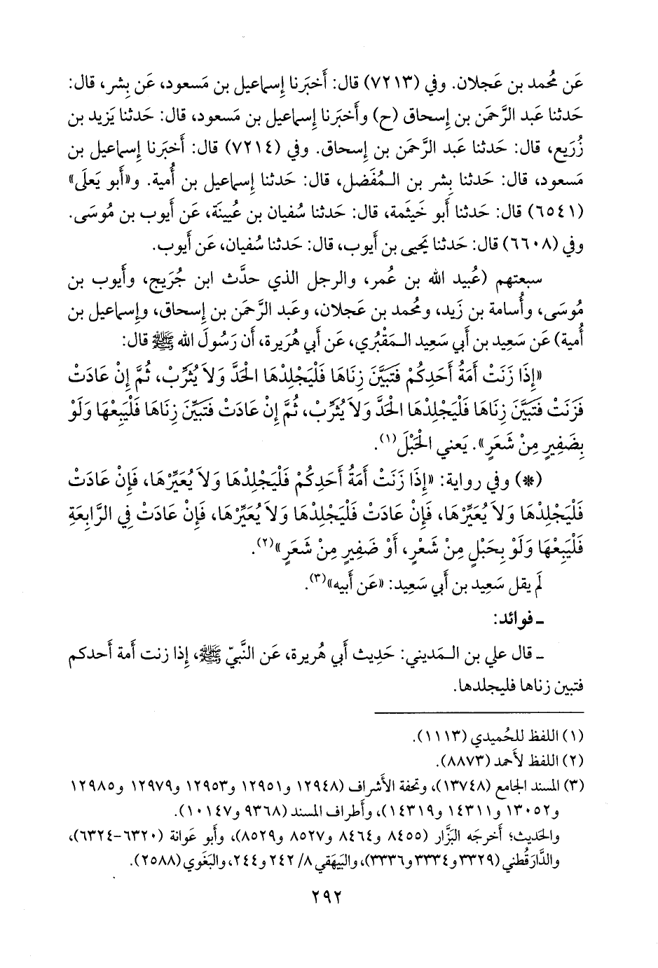 - قال علي ابن المديني: حديث أبي هريرة، عن النبي صَلى الله عَليه وسَلم إذا زنت أمة أحدكم فتبين زناها فليجلدها.
