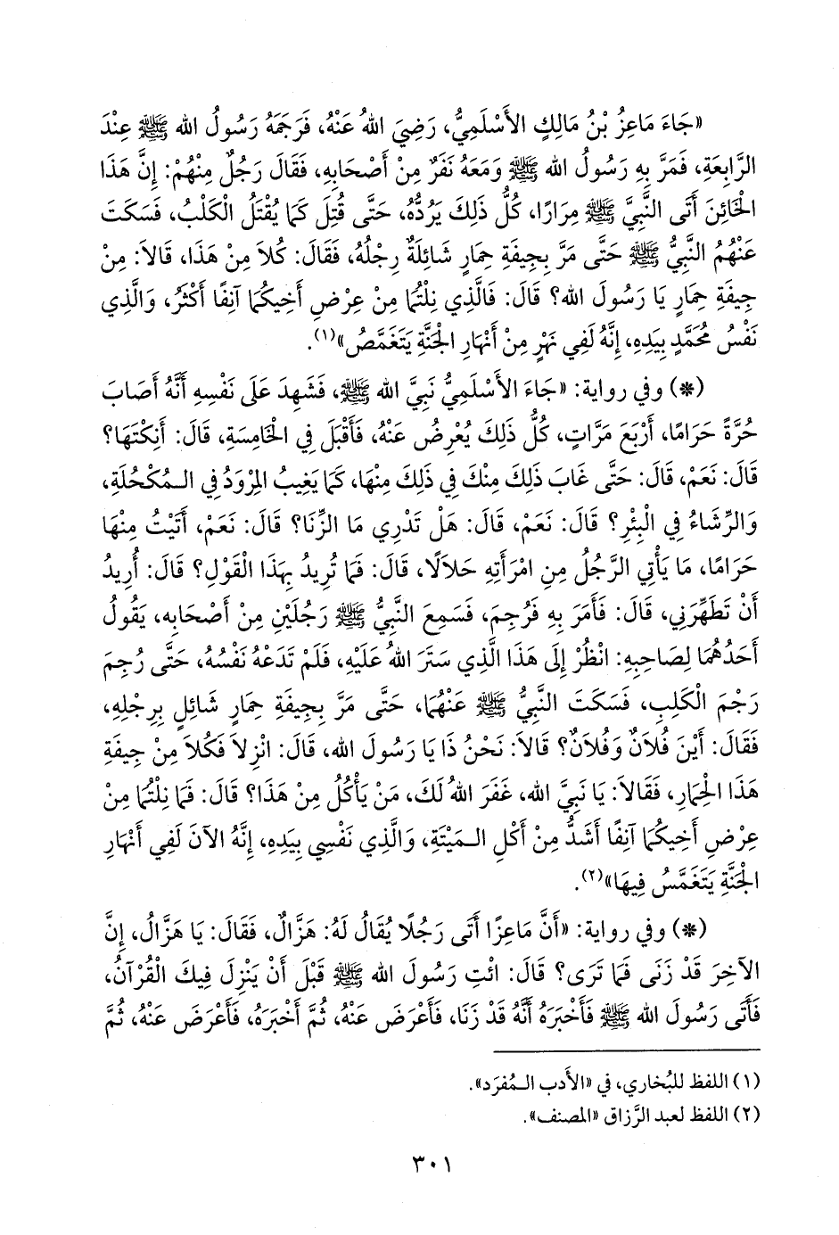 - وفي رواية: «جاء الأسلمي نبي الله صَلى الله عَليه وسَلم فشهد على نفسه أنه أصاب حرة حراما، أربع مرات، كل ذلك يعرض عنه، فأقبل في الخامسة، قال: أنكتها؟ قال: نعم، قال: حتى غاب ذلك منك في ذلك منها، كما يغيب المرود في المكحلة، والرشاء في البئر؟ قال: نعم، قال: هل تدري ما الزنا؟ قال: نعم، أتيت منها حراما، ما يأتي الرجل من امرأته حلالا، قال: فما تريد بهذا القول؟ قال: أريد أن تطهرني، قال: فأمر به فرجم، فسمع النبي صَلى الله عَليه وسَلم رجلين من أصحابه، يقول أحدهما لصاحبه: انظر إلى هذا الذي ستر الله عليه، فلم تدعه نفسه، حتى رجم رجم الكلب، فسكت النبي صَلى الله عَليه وسَلم عنهما، حتى مر بجيفة حمار شائل برجله، فقال: أين فلان وفلان؟ قالا: نحن ذا يا رسول الله، قال: انزلا فكلا من جيفة هذا الحمار، فقالا: يا نبي الله، غفر الله لك، من ياكل من هذا؟ قال: فما نلتما من عرض أخيكما آنفا أشد من أكل الميتة، والذي نفسي بيده، إنه الآن لفي أنهار الجنة يتغمس فيها» (¬١).