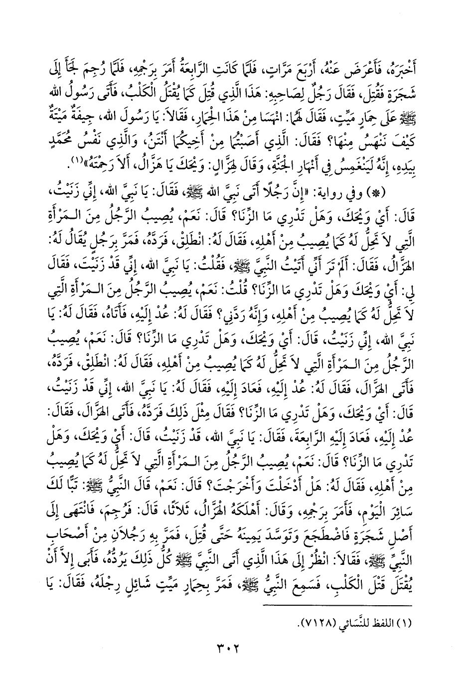 - وفي رواية: «إن رجلا أتى نبي الله صَلى الله عَليه وسَلم فقال: يا نبي الله، إني زنيت، قال: أي ويحك، وهل تدري ما الزنا؟ قال: نعم، يصيب الرجل من المرأة التي لا تحل له كما يصيب من أهله، فقال له: انطلق، فرده، فمر برجل يقال له: الهزال, فقال: ألم تر أني أتيت النبي صَلى الله عَليه وسَلم فقلت: يا نبي الله، إني قد زنيت، فقال لي: أي ويحك وهل تدري ما الزنا؟ قلت: نعم، يصيب الرجل من المرأة التي لا تحل له كما يصيب من أهله، وإنه ردني؟ فقال له: عد إليه، فأتاه، فقال له: يا نبي الله، إني زنيت، قال: أي ويحك، وهل تدري ما الزنا؟ قال: نعم، يصيب الرجل من المرأة التي لا تحل له كما يصيب من أهله، فقال له: انطلق، فرده، فأتى الهزال، فقال له: عد إليه, فعاد إليه، فقال له: يا نبي الله، إني قد زنيت، قال: أي ويحك، وهل تدري ما الزنا؟ فقال مثل ذلك فرده، فأتى الهزال، فقال: عد إليه، فعاد إليه الرابعة، فقال: يا نبي الله، قد زنيت، قال: أي ويحك، وهل تدري ما الزنا؟ قال: نعم، يصيب الرجل من المرأة التي لا تحل له كما يصيب من أهله، فقال له: هل أدخلت وأخرجت؟ قال: نعم، قال النبي صَلى الله عَليه وسَلم: تبا لك سائر اليوم، فأمر برجمه، وقال: أهلكه الهزال، ثلاثا، قال: فرجم، فانتهى إلى أصل شجرة فاضطجع وتوسد يمينه حتى قتل، فمر به رجلان من أصحاب النبي صَلى الله عَليه وسَلم فقالا: انظر إلى هذا الذي أتى النبي صَلى الله عَليه وسَلم كل ذلك يرده، فأبى إلا أن يقتل قتل الكلب، فسمع النبي صَلى الله عَليه وسَلم فمر بحمار ميت شائل رجله، فقال: يا
