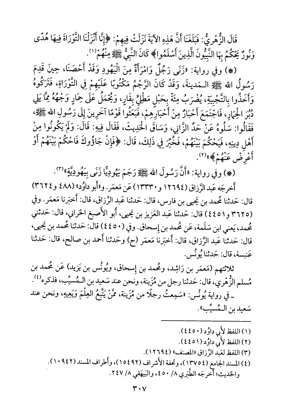 - وفي رواية: «أن رسول الله صَلى الله عَليه وسَلم رجم يهوديا زنى بيهودية» (¬٢).