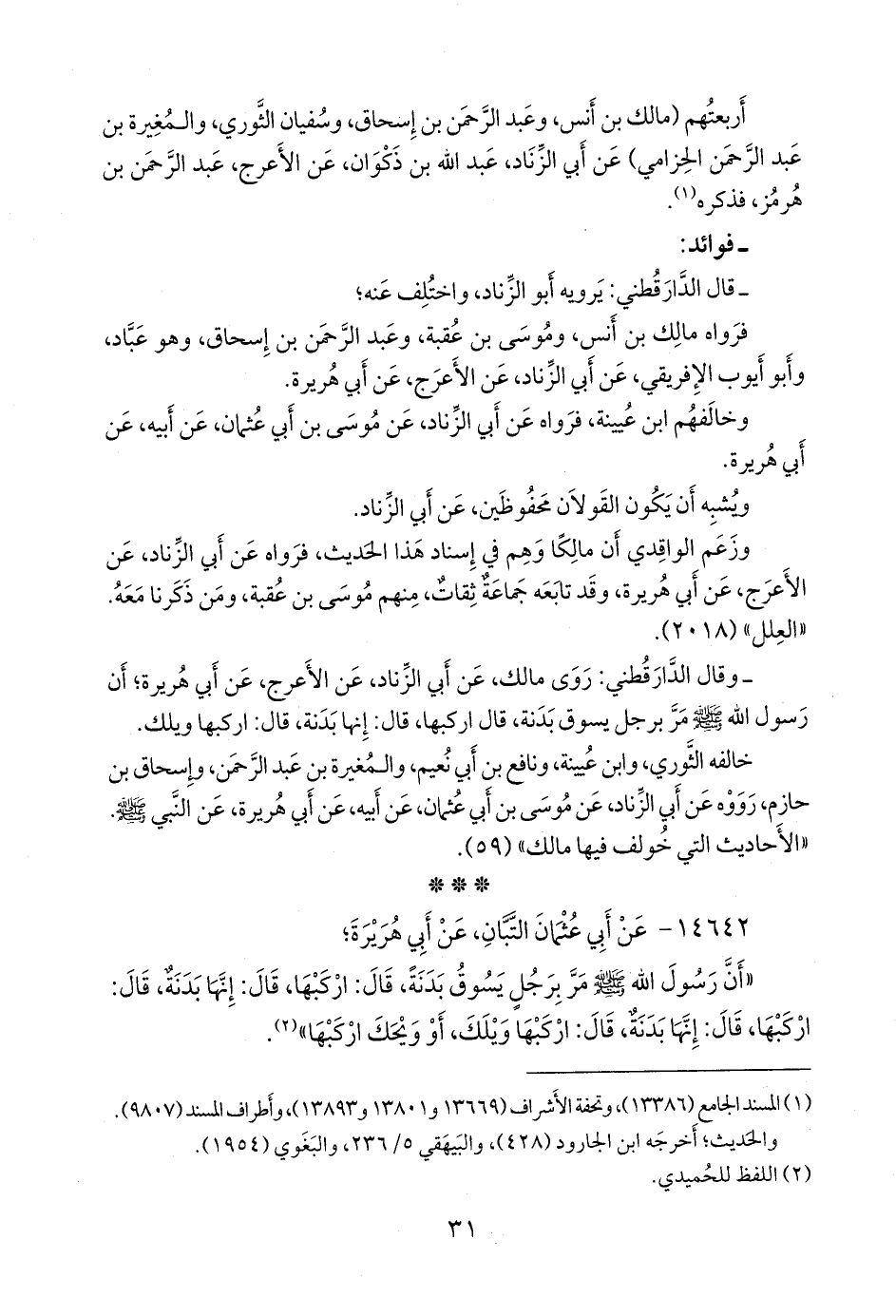 - وقال الدارقُطني: روى مالك، عن أبي الزناد، عن الأعرج، عن أبي هريرة؛ أن رسول الله صَلى الله عَليه وسَلم مر برجل يسوق بدنة، قال اركبها، قال: إنها بدنة، قال: اركبها ويلك.