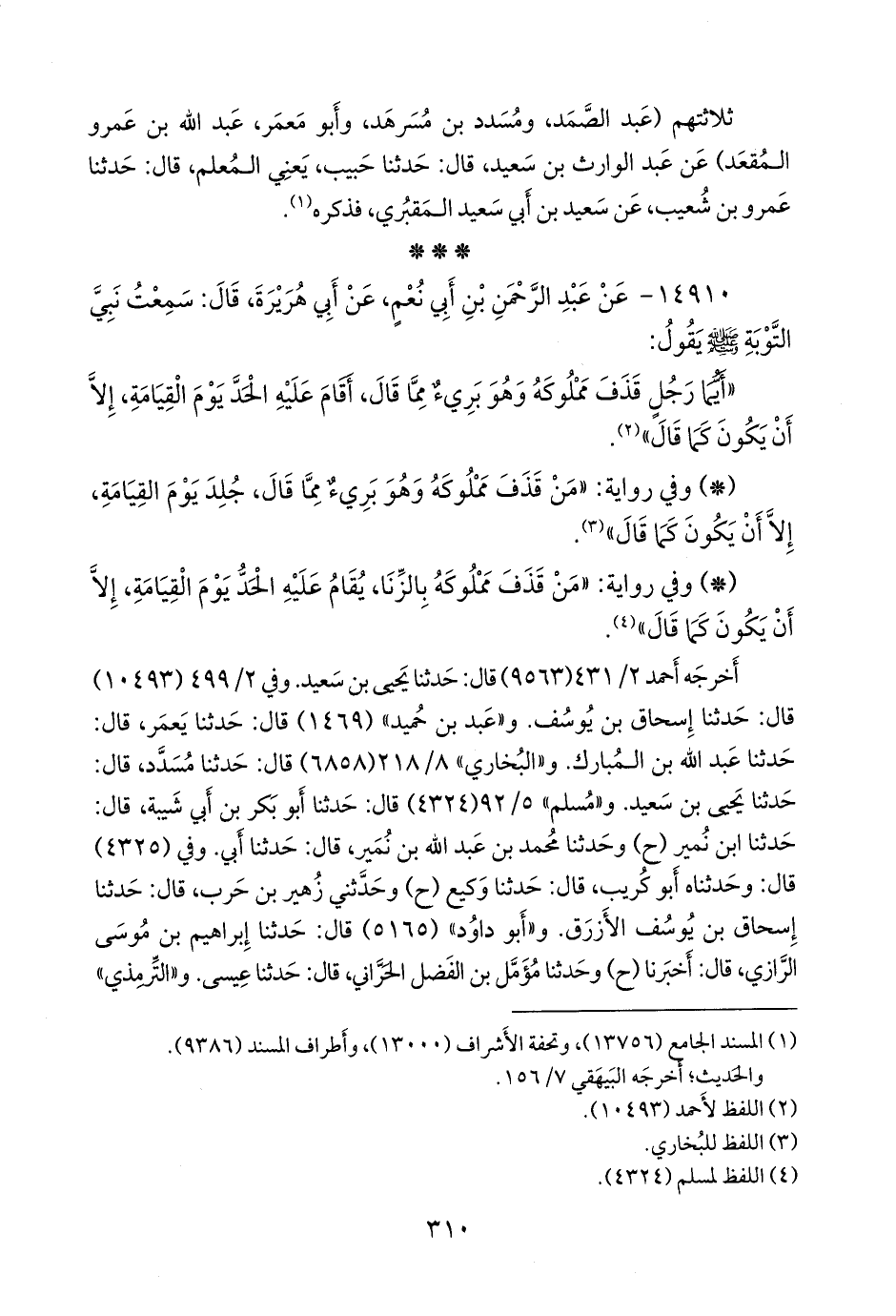 ١٤٩١٠ - عن عبد الرَّحمَن بن أَبي نُعْم، عن أبي هريرة، قال: سمعت نبي التوبة صَلى الله عَليه وسَلم يقول: