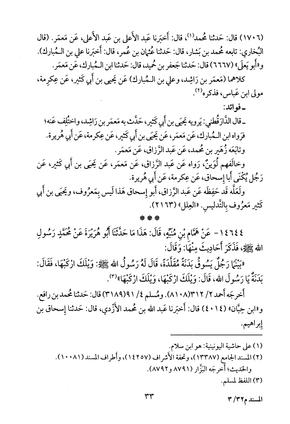 ثلاثتهم (أحمد بن حنبل، ومحمد بن رافع، وإسحاق بن إبراهيم) عن عبد الرزاق بن همام، قال: حدثنا مَعمَر بن راشد، عن همام بن مُنَبِّه، فذكره (¬٢).