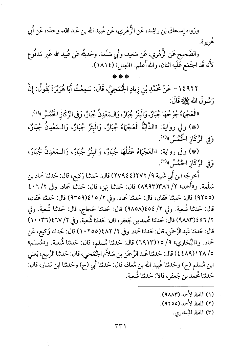 - وفي رواية: «العجماء عقلها جبار، والبئر جبار، والمعدن جبار، وفي الركاز الخمس» (¬٣).
