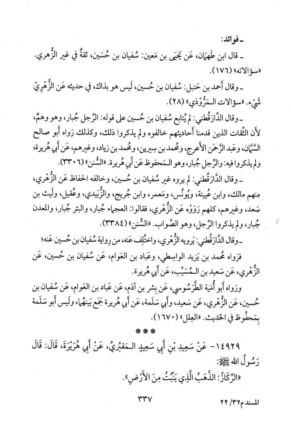 - وقال الدارقُطني: لم يروه غير سفيان بن حسين، وخالفه الحفاظ عن الزُّهْري، منهم مالك، وابن عُيينة، ويونس، ومعمر، وابن جُريج، والزبيدي، وعقيل، وليث بن سعد، وغيرهم، كلهم رووه عن الزُّهْري، فقالوا: العجماء جبار، والبئر جبار، والمعدن جبار، ولم يذكروا الرجل، وهو الصواب. «السنن» (٣٣٨٤).