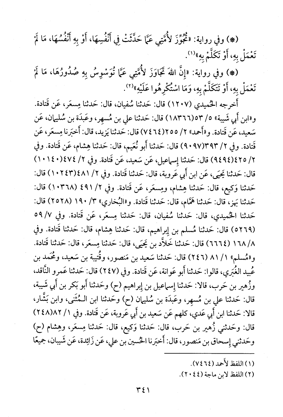 وفي ٢/ ٤٧٤ (١٠١٤٠) قال: حدثنا يحيى، عن ابن أبي عَروبَة، قال: حدثنا قتادة. وفي ٢/ ٤٨١ (١٠٢٤٣) قال: حدثنا وكيع، قال: حدثنا هشام، ومسعر، عن قتادة. وفي ٢/ ٤٩١ (١٠٣٦٨) قال: حدثنا بَهز، قال: حدثنا همام، قال: حدثنا قتادة. و «البخاري» ٣/ ١٩٠ (٢٥٢٨) قال: حدثنا الحميدي، قال: حدثنا سفيان، قال: حدثنا مسعر، عن قتادة. وفي ٧/ ٥٩ (٥٢٦٩) قال: حدثنا مسلم بن إبراهيم، قال: حدثنا هشام، قال: حدثنا قتادة. وفي ٨/ ١٦٨ (٦٦٦٤) قال: حدثنا خلاد بن يحيى، قال: حدثنا مسعر، قال: حدثنا قتادة. و «مسلم» ١/ ٨١ (٢٤٦) قال: حدثنا سعيد بن منصور، وقتيبة بن سعيد، ومحمد بن عُبيد الغبري، قالوا: حدثنا أَبو عَوانة، عن قتادة. وفي (٢٤٧) قال: حدثنا عَمرو الناقد، وزهير بن حرب، قالا: حدثنا إسماعيل بن إبراهيم (ح) وحدثنا أَبو بكر بن أبي شيبة، قال: حدثنا علي بن مُسهِر، وعَبدة بن سليمان (ح) وحدثنا ابن المثنى، وابن بشار، قالا: حدثنا ابن أَبي عَدي، كلهم عن سعيد بن أبي عَروبَة، عن قتادة. وفي ١/ ٨٢ (٢٤٨) قال: وحدثني زهير بن حرب، قال: حدثنا وكيع، قال: حدثنا مسعر، وهشام (ح) وحدثني إسحاق بن منصور، قال: أخبرنا الحسين بن علي، عن زائدة، عن شَيبان، جميعا