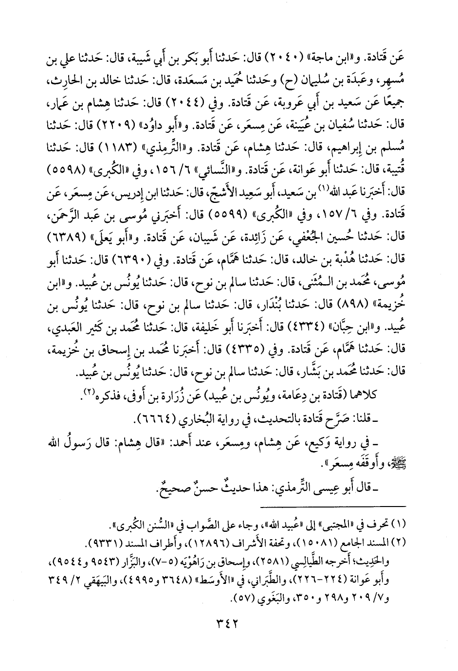 و «النَّسَائي» ٦/ ١٥٦, وفي «الكبرى» (٥٥٩٨) قال: أخبرنا عبد الله (¬١) بن سعيد، أَبو سعيد الأشج، قال: حدثنا ابن إدريس، عن مسعر، عن قتادة. وفي ٦/ ١٥٧, وفي «الكبرى» (٥٥٩٩) قال: أخبرني موسى بن عبد الرَّحمَن، قال: حدثنا حسين الجعفي، عن زائدة، عن شَيبان، عن قتادة. و «أَبو يَعلى» (٦٣٨٩) قال: حدثنا هُدبة بن خالد، قال: حدثنا همام، عن قتادة. وفي (٦٣٩٠) قال: حدثنا أَبو موسى، محمد بن المثنى، قال: حدثنا سالم بن نوح، قال: حدثنا يونس بن عبيد. و «ابن خزيمة» (٨٩٨) قال: حدثنا بُندَار، قال: حدثنا سالم بن نوح، قال: حدثنا يونس بن عبيد. و «ابن حِبَّان» (٤٣٣٤) قال: أخبرنا أَبو خليفة، قال: حدثنا محمد بن كثير العبدي، قال: حدثنا همام، عن قتادة. وفي (٤٣٣٥) قال: أخبرنا محمد بن إسحاق بن خزيمة، قال: حدثنا محمد بن بشار، قال: حدثنا سالم بن نوح، قال: حدثنا يونس بن عبيد.