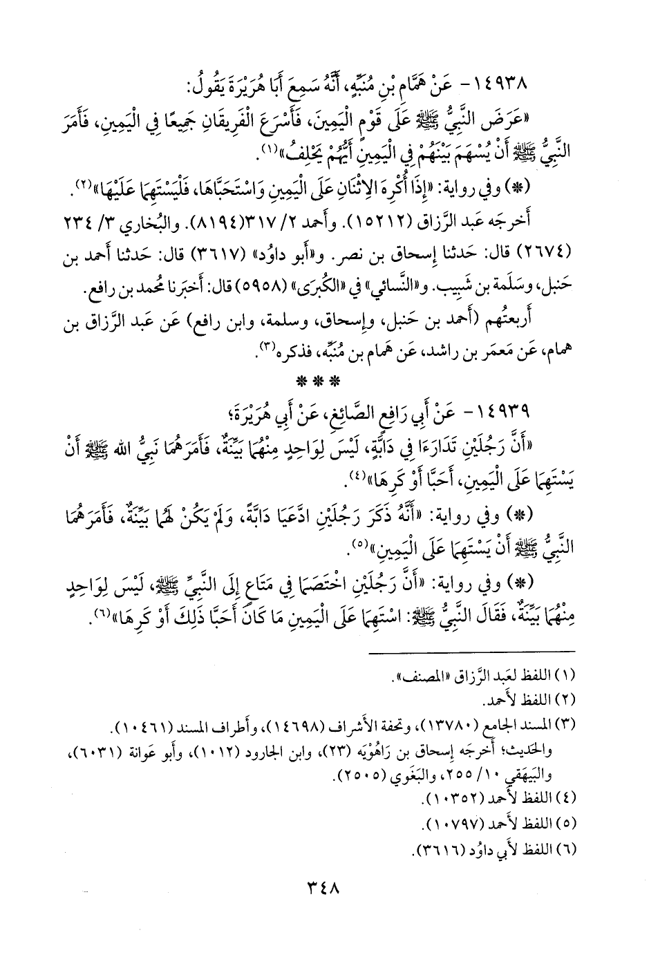 - وفي رواية: «أنه ذكر رجلين ادعيا دابة، ولم يكن لهما بينة، فأمرهما النبي صَلى الله عَليه وسَلم أن يستهما على اليمين» (¬٢).