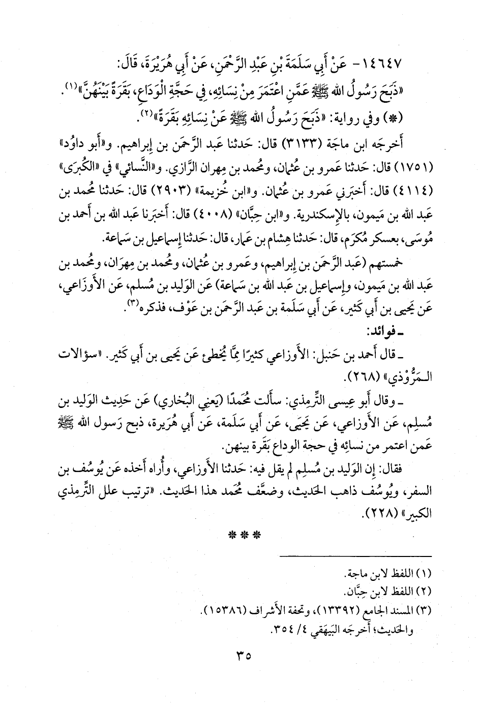 - وقال التِّرمِذي: سألتُ محمدًا، يعني ابن إسماعيل البخاري، عن حديث الوليد بن مسلم، عن الأوزاعي، عن يحيى، عن أبي سلمة، عن أبي هريرة، ذبح رسول الله صَلى الله عَليه وسَلم عمن اعتمر من نسائه في حجة الوداع بقرة بينهن.