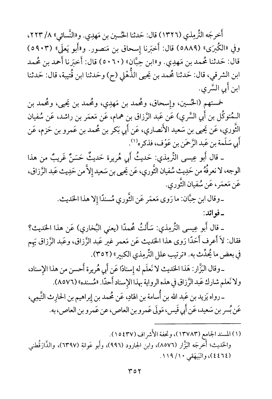 - وقال البزار: هذا الحديث لا نعلم له إسنادا عن أبي هريرة أحسن من هذا الإسناد، ولا نعلم شارك عبد الرزاق في هذه الرواية بهذا الإسناد أحدا. «مسنده» (٨٥٧٦).