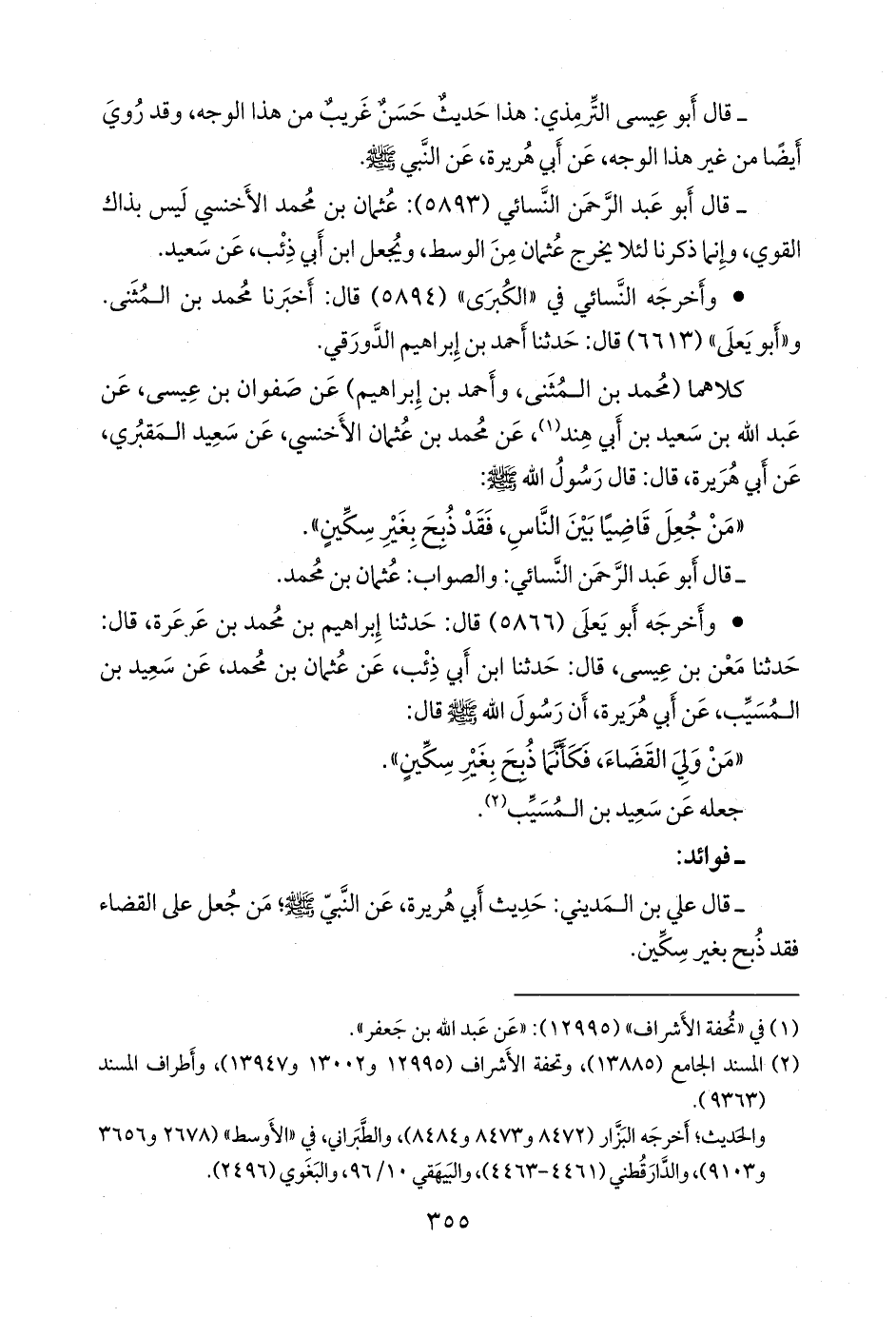 - قال علي بن المديني: حديث أبي هريرة، عن النبي صَلى الله عَليه وسَلم؛ من جعل على القضاء فقد ذبح بغير سكين.