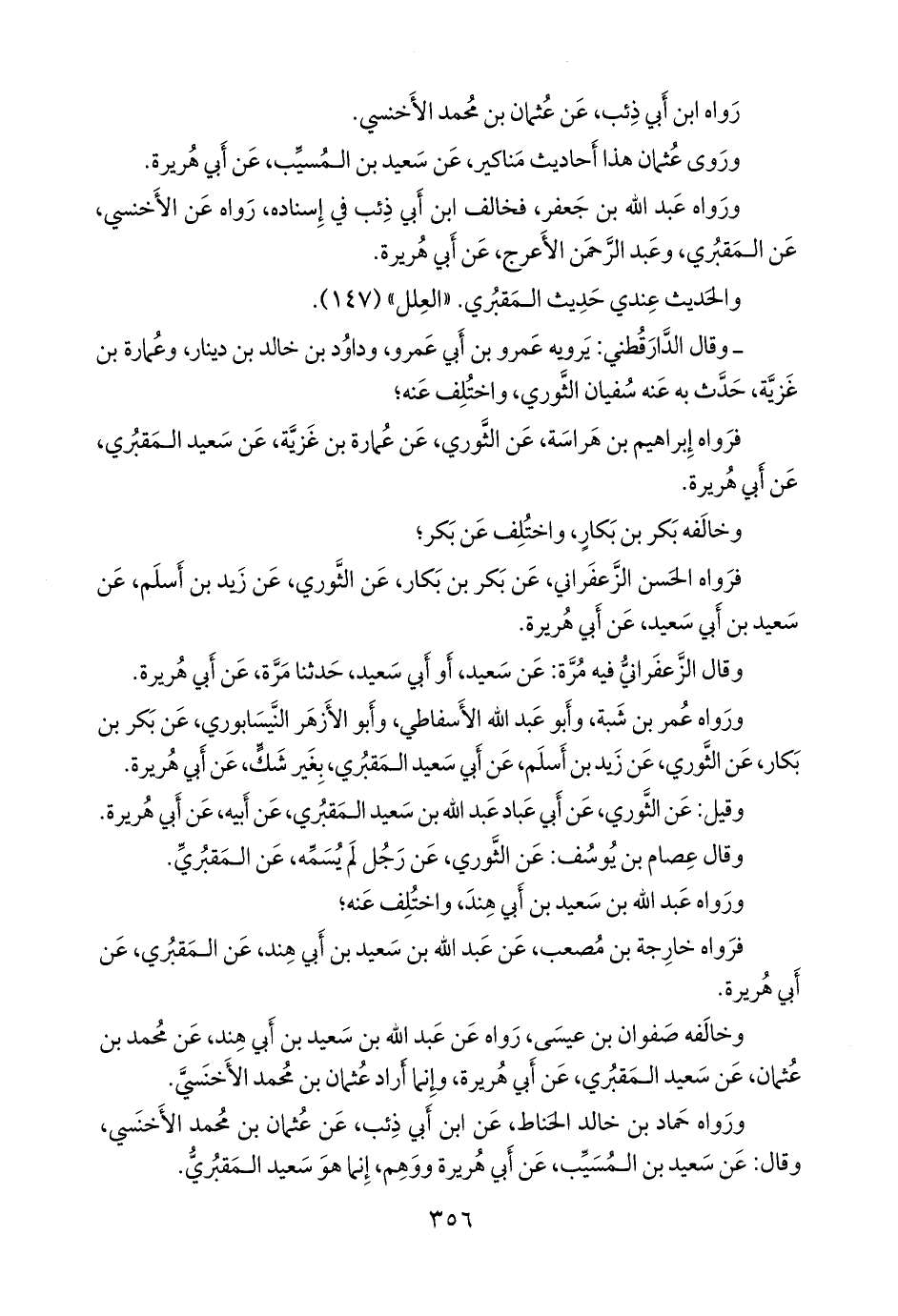 ورواه عبد العزيز بن المطلب، عن عثمان الأخنسي، عن سعيد المَقبُري، قاله العباس بن أبي سلمة، عن عبد العزيز، ولم يُتَابَع عليه.