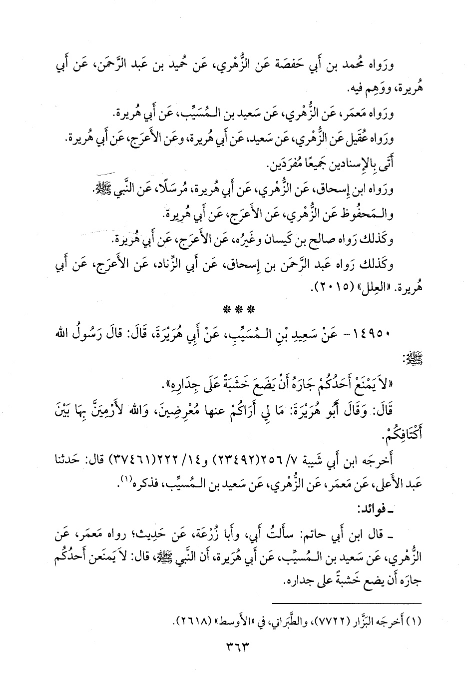 - قال عبد الرَّحمَن بن أبي حاتم الرازي: سألت أبي، وأَبا زُرعَة، عن حديث؛ رواه مَعمَر، عن الزُّهْري، عن سعيد بن المُسَيب، عن أبي هريرة، أن النبي صَلى الله عَليه وسَلم قال: لا يمنعن أحدكم جاره أن يضع خشبة على جداره.