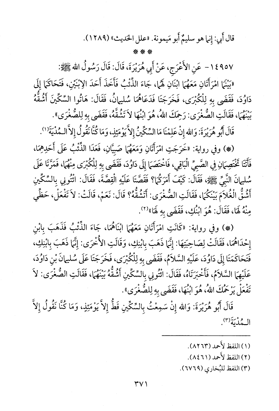 - وفي رواية: «بينما امرأَتان نائمتان معهما ولداهما، عدا الذئب عليهما، فأَخذ ولد إِحداهما، فاختصما إِلى داود في الباقي، فقضى به للكبرى منهما، فخرجتا فلقيهما سليمان بن داود، فقال: ما قضى به الملك بينكما؟ قالت الصغرى: قضى به للكبرى، قال سليمان: هاتوا السكين نشقه بينكما، قالت الصغرى: هو للكبرى دعه لها، فقال سليمان: هو لك خذيه، يعني الصغرى، حين رأَى رحمتها له».