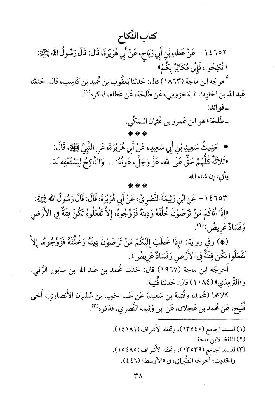 - وفي رواية: «إذا خطب إليكم من ترضون دينه وخلقه فزوجوه، إلا تفعلوا تكن فتنة في الأرض وفساد عريض».
