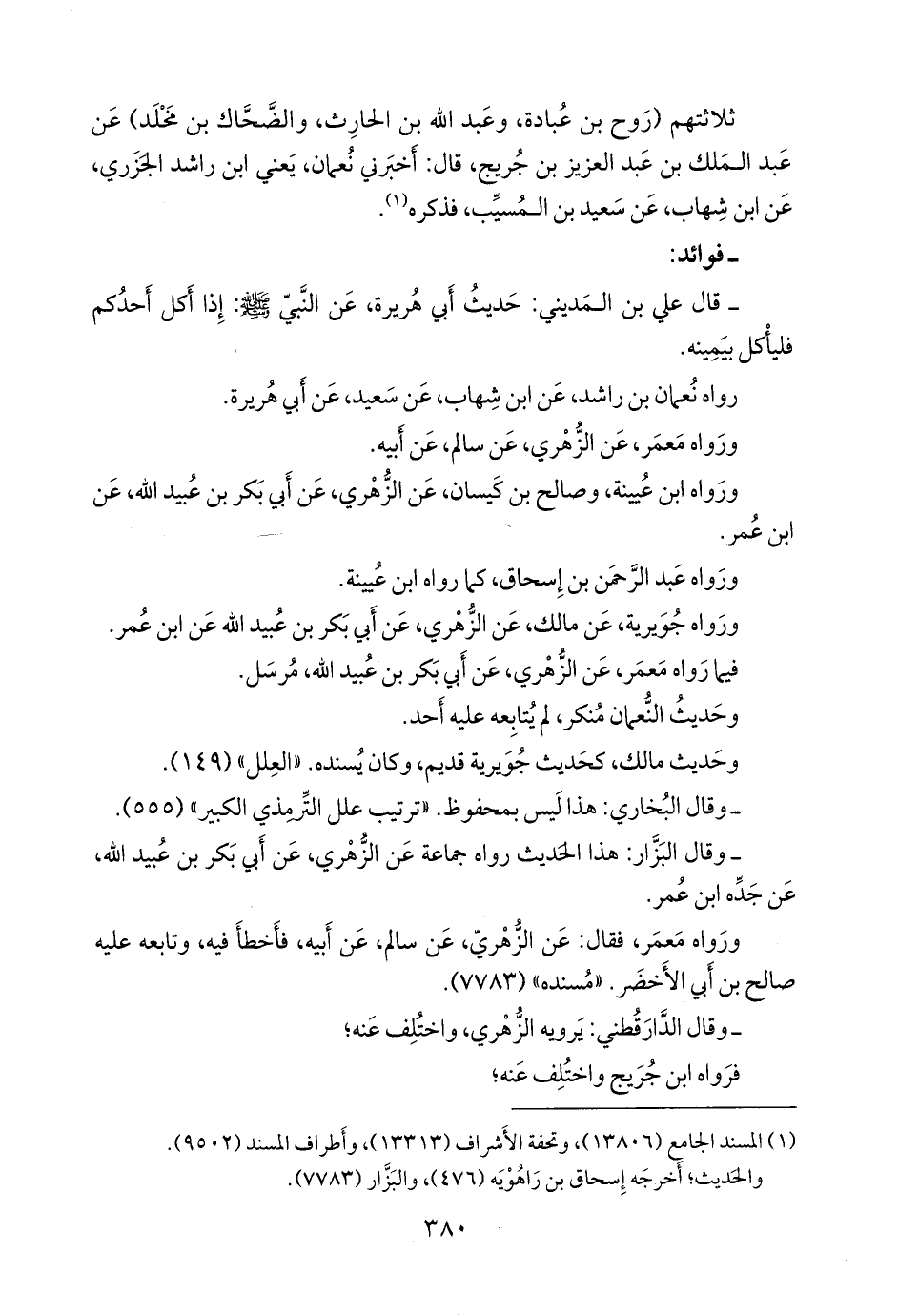 - قال علي بن المديني: حديث أبي هريرة، عن النبي صَلى الله عَليه وسَلم: إذا أكل أحدكم فلياكل بيمينه.