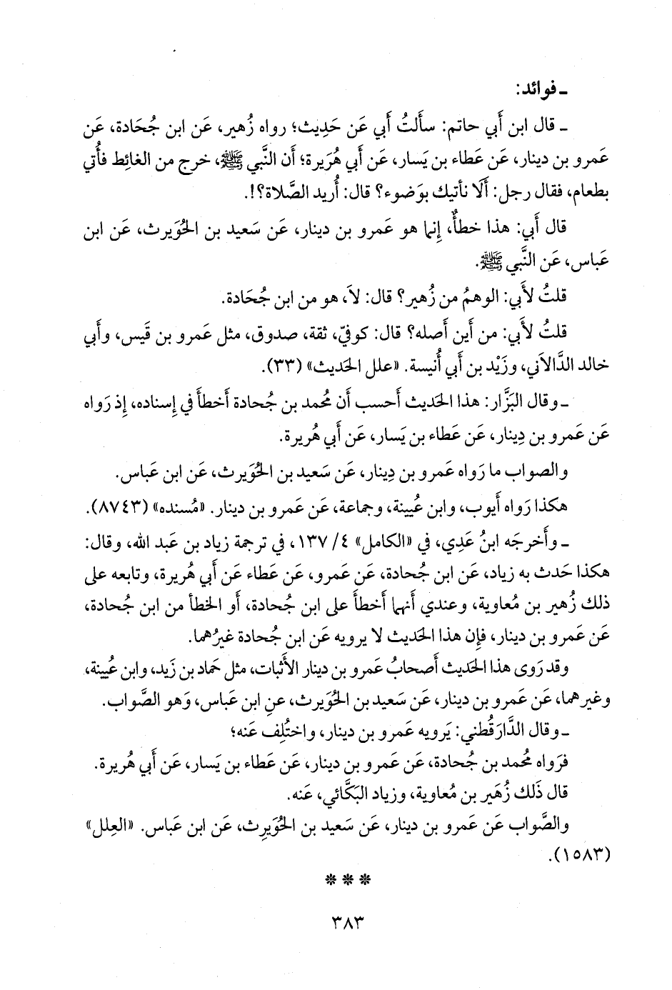 - قال عبد الرَّحمَن بن أبي حاتم الرازي: سألتُ أبي عن حديثٍ؛ رواه زهير، عن ابن جحادة، عن عَمرو بن دينار، عن عطاء بن يسار، عن أبي هريرة؛ أن النبي صَلى الله عَليه وسَلم خرج من الغائط فأتي بطعام، فقال رجل: ألا نأتيك بوضوء؟ قال: أريد الصلاة؟!.