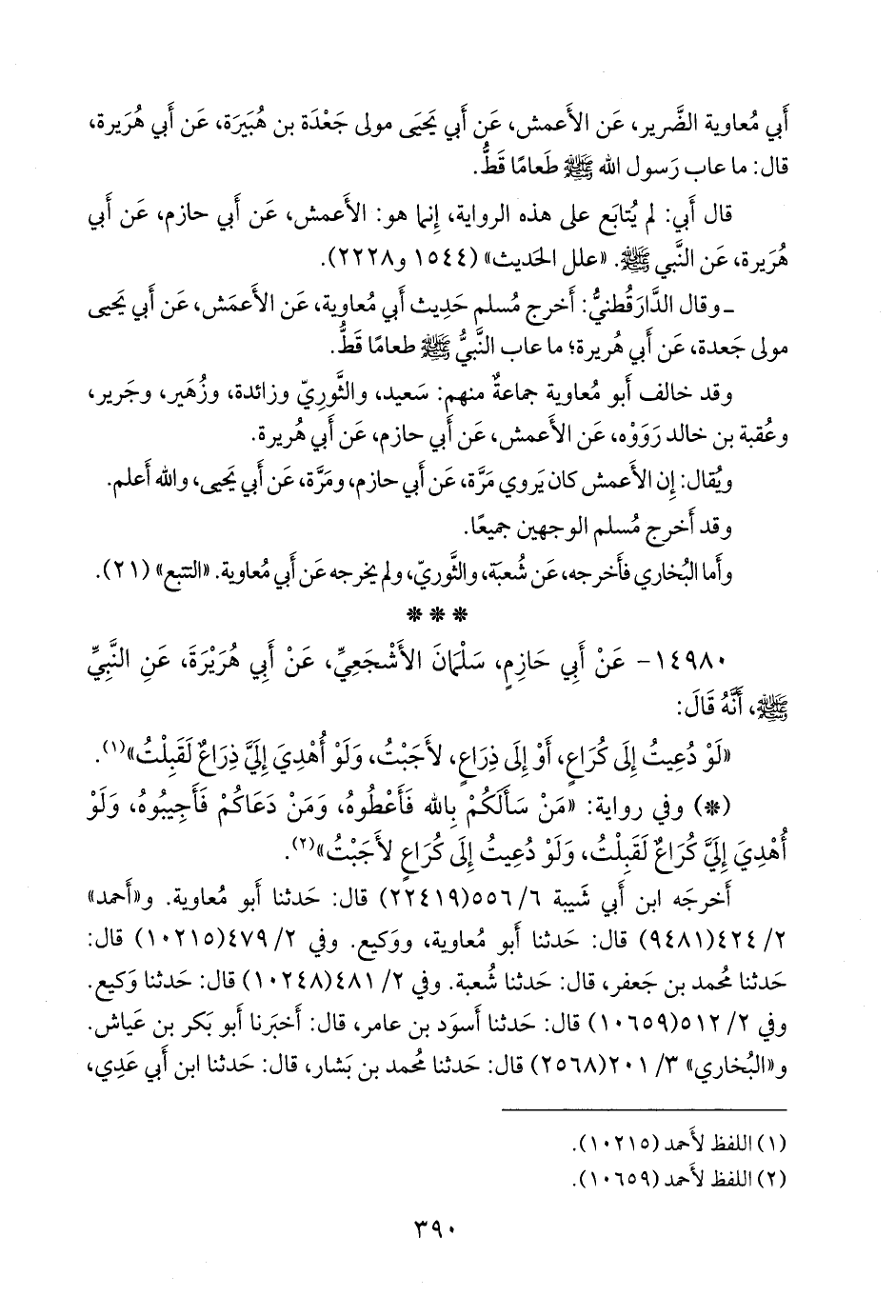١٤٩٨٠ - عن أبي حازم سَلمان الأشجعي، عن أبي هريرة، عن النبي صَلى الله عَليه وسَلم أنه قال: