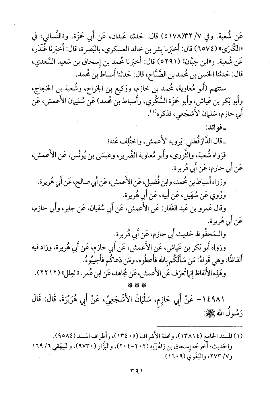 ١٤٩٨١ - عن أبي حازم سَلمان الأشجعي، عن أبي هريرة، قال: قال رسول الله صَلى الله عَليه وسَلم: