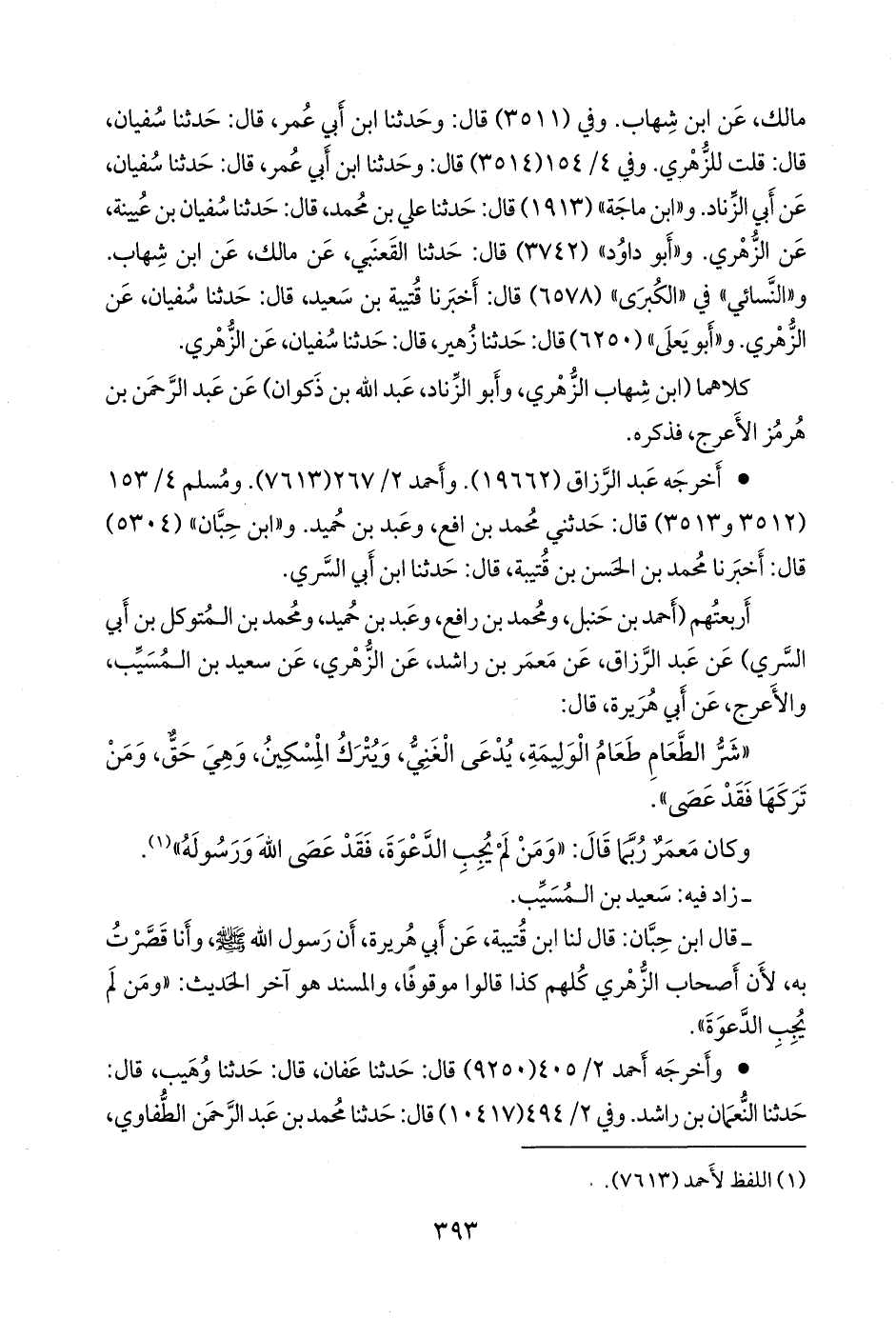 - قال ابن حبان: قال لنا ابن قتيبة، عن أبي هريرة، أن رسول الله صَلى الله عَليه وسَلم وأنا قصرت به، لأن أصحاب الزُّهْري كلهم كذا قالوا موقوفًا، والمسند هو آخر الحديث: «ومن لم يجب الدعوة».