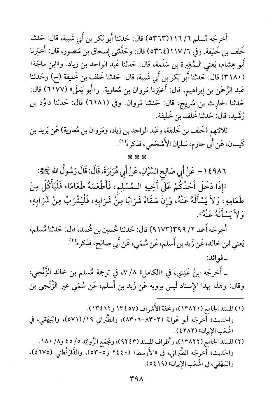 أخرجه أحمد (٩١٧٣) قال: حدثنا حسين بن محمد، قال: حدثنا مسلم، يعني ابن خالد، عن زيد بن أسلم، عن سمي، عن أبي صالح، فذكره (¬١).