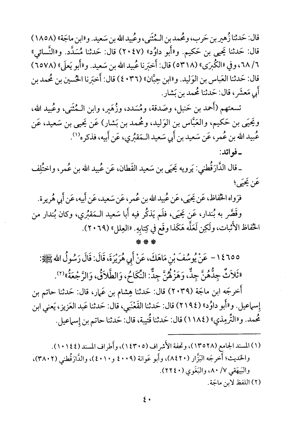 أخرجه ابن ماجة (٢٠٣٩) قال: حدثنا هشام بن عمار، قال: حدثنا حاتم بن إسماعيل. و «أَبو داود» (٢١٩٤) قال: حدثنا القَعنَبي، قال: حدثنا عبد العزيز، يعني ابن محمد. و «التِّرمِذي» (١١٨٤) قال: حدثنا قتيبة، قال: حدثنا حاتم بن إسماعيل.