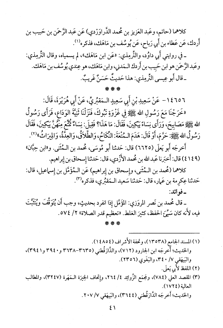 كلاهما (محمد بن المثنى، وإسحاق بن إبراهيم) عن المُؤَمَّل بن إسماعيل، قال: حدثنا عكرمة بن عمار، قال: حدثنا سعيد المَقبُري، فذكره (¬٢).