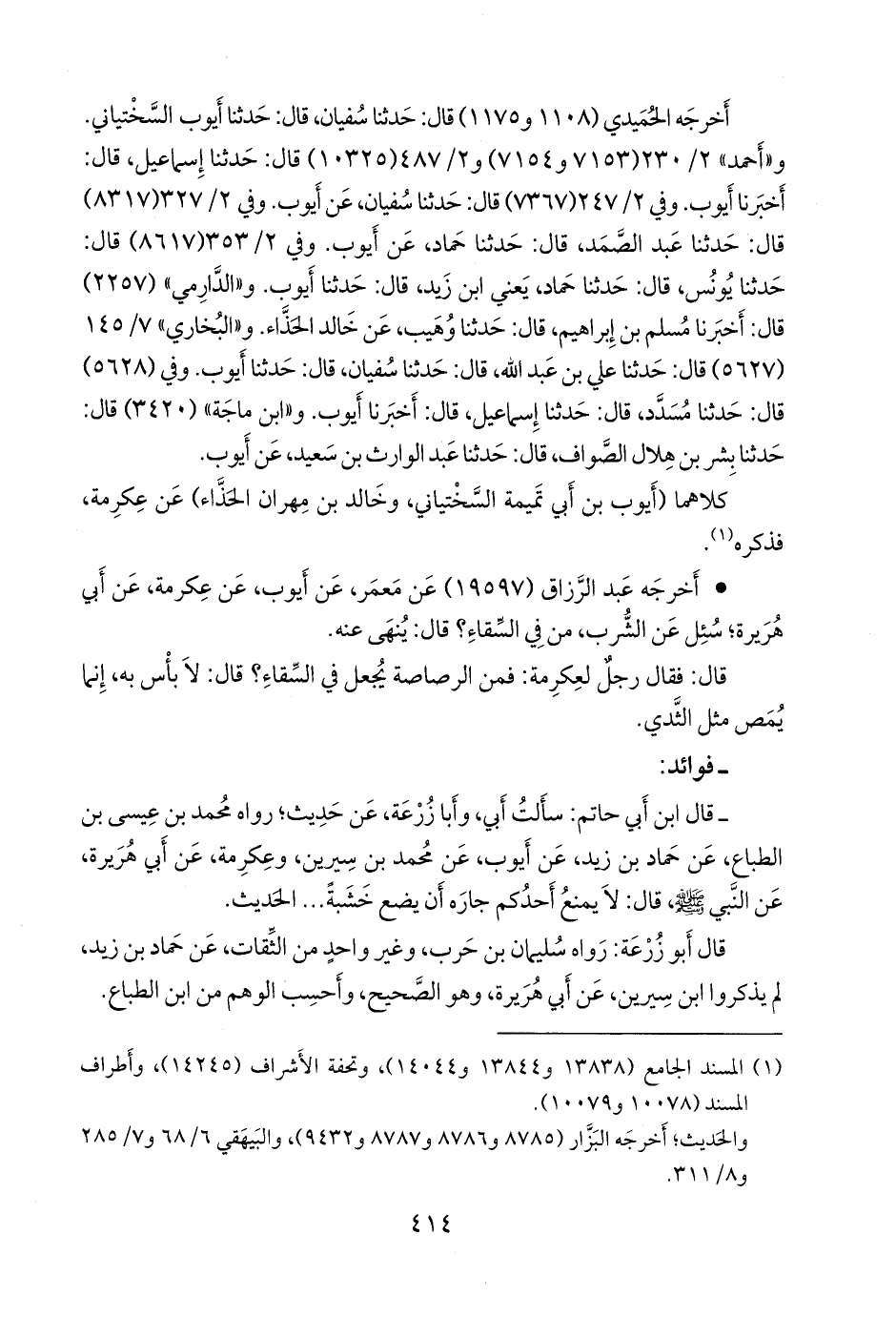 قال أبي: رواه وهيب، وابن عُلَية، وابن عُيينة، فقالوا: عن أيوب، عن عكرمة، عن أبي هريرة، عن النبي صَلى الله عَليه وسَلم ولا يذكرون ابن سِيرين.