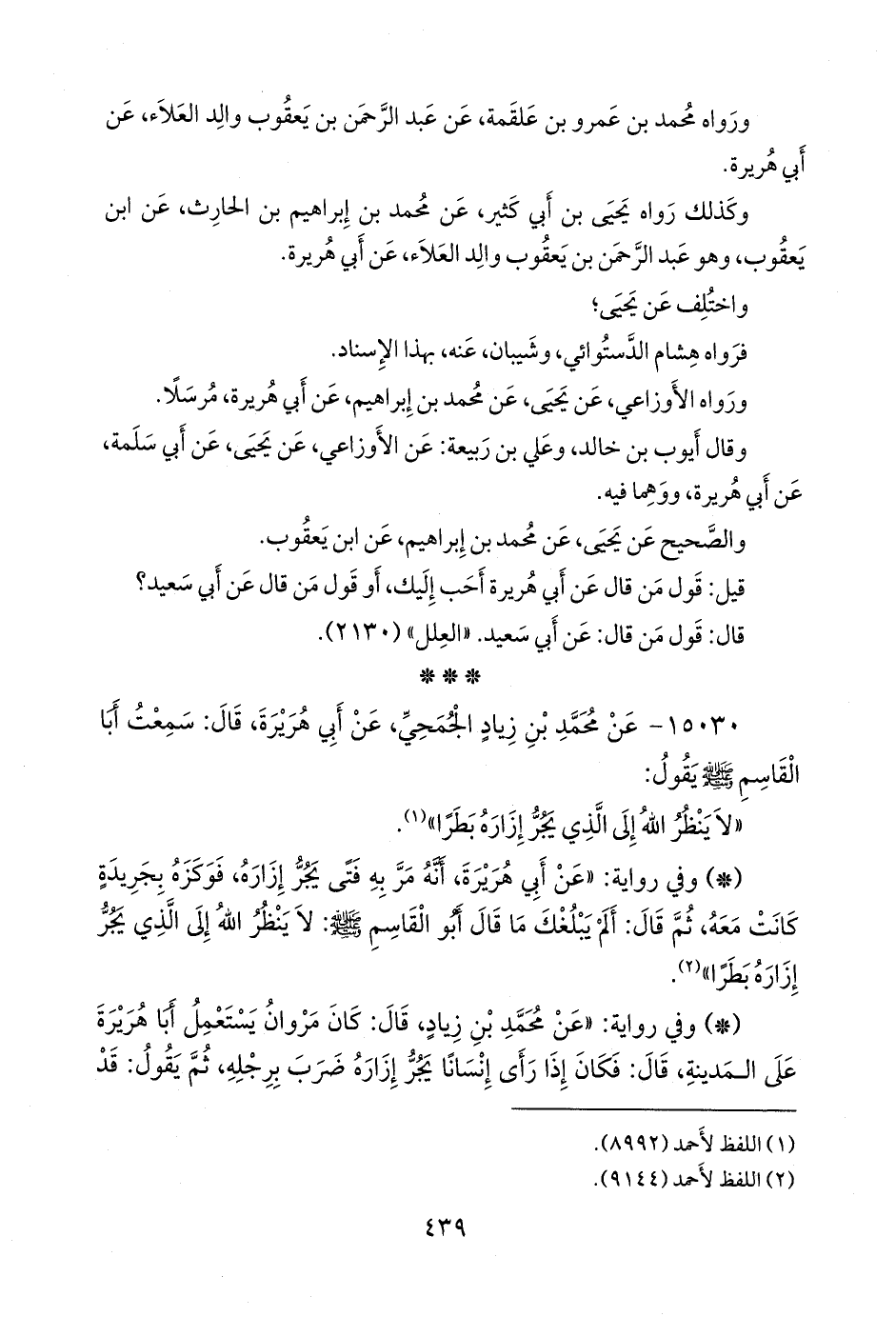 - وفي رواية: «عن أبي هريرة، أنه مر به فتى يجر إزاره، فوكزه بجريدة كانت معه، ثم قال: ألم يبلغك ما قال أَبو القاسم صَلى الله عَليه وسَلم: لا ينظر الله إلى الذي يجر إزاره بطرا» (¬٢).