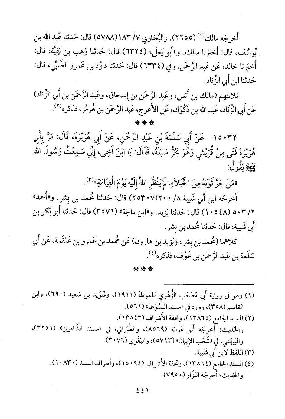 ١٥٠٣٢ - عن أبي سلمة بن عبد الرَّحمَن، عن أبي هريرة، قال: مر بأبي هريرة فتى من قريش وهو يجر سبله، فقال: يا ابن أخي، إني سمعت رسول الله صَلى الله عَليه وسَلم يقول: