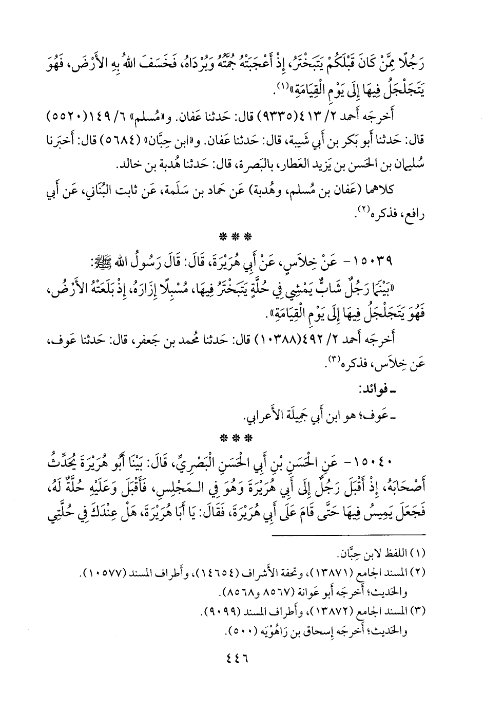 ١٥٠٤٠ - عن الحسن بن أبي الحسن البصري، قال: بينا أَبو هريرة يحدث أصحابه، إذ أقبل رجل إلى أبي هريرة وهو في المجلس، فأقبل وعليه حلة له، فجعل يميس فيها حتى قام على أبي هريرة، فقال: يا أبا هريرة، هل عندك في حلتي