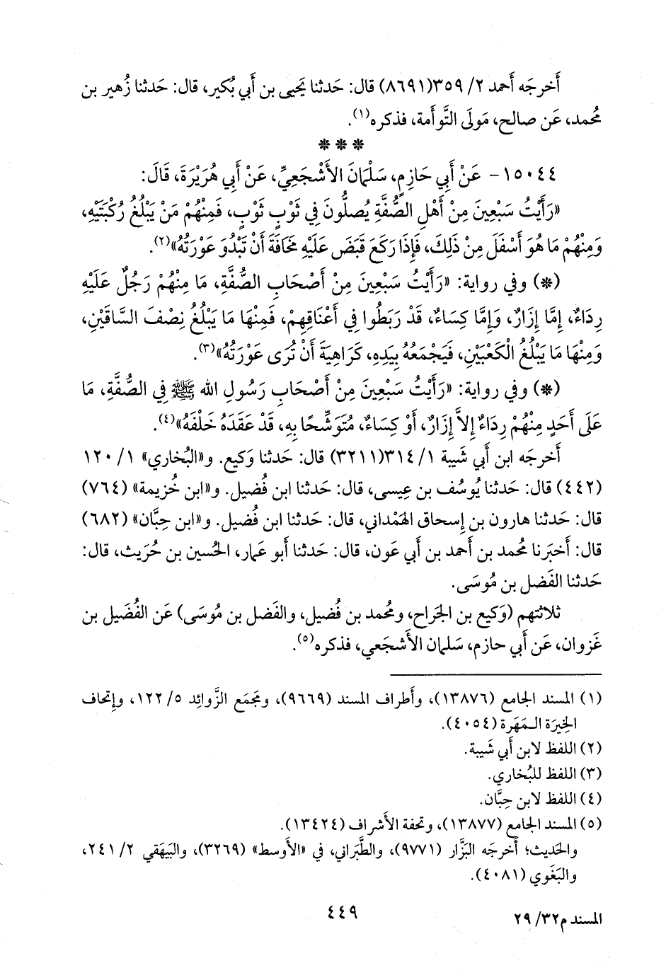 - وفي رواية: «رأيت سبعين من أصحاب الصفة، ما منهم رجل عليه رداء، إما إزار، وإما كساء، قد ربطوا في أعناقهم، فمنها ما يبلغ نصف الساقين، ومنها ما يبلغ الكعبين، فيجمعه بيده، كراهية أن ترى عورته» (¬٢).