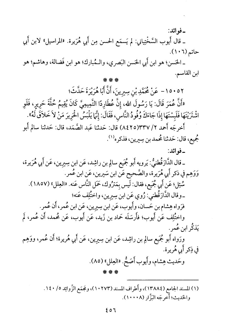 - قال الدارقُطني: يرويه أَبو جميع سالم بن راشد، عن ابن سِيرين، عن أبي هريرة، ووهم في ذكر أبي هريرة، والصحيح عن ابن سِيرين، عن ابن عمر.