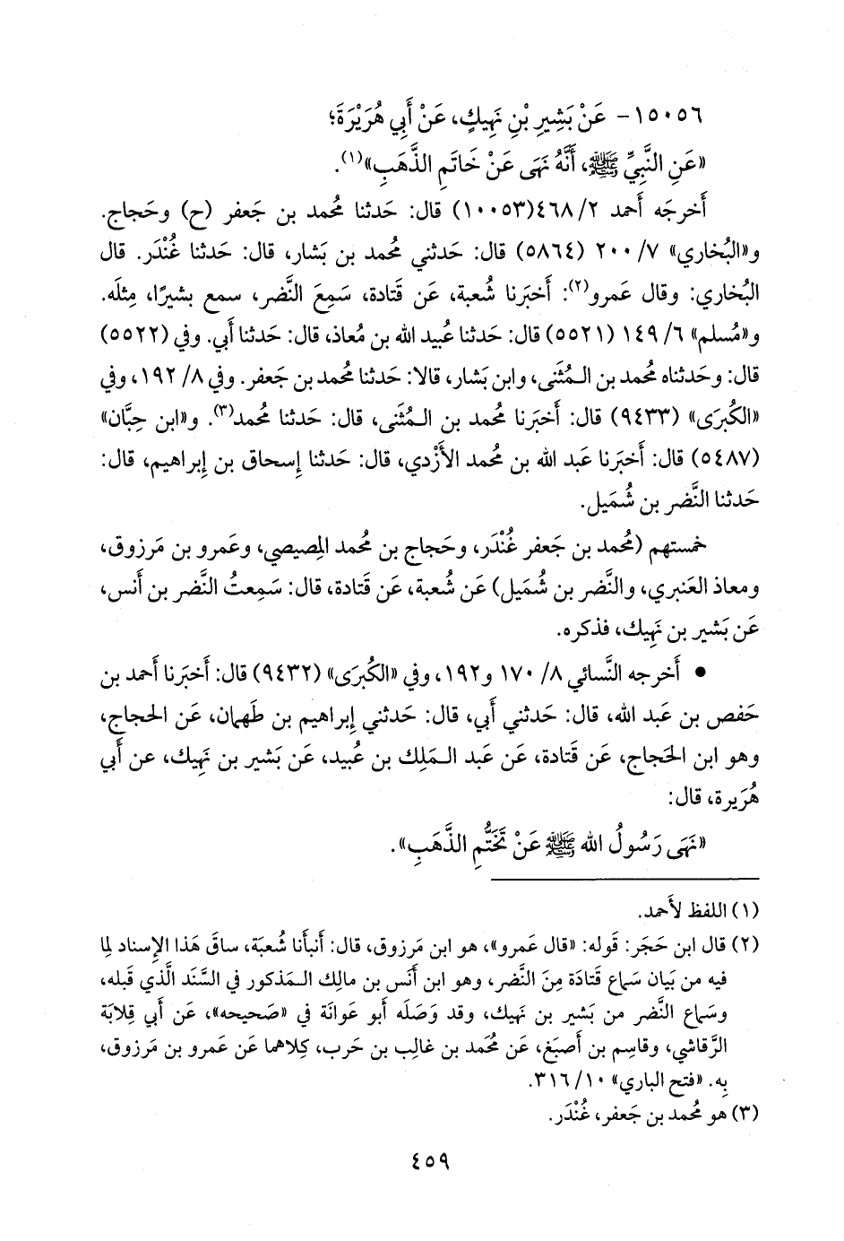 خمستهم (محمد بن جعفر غُندَر، وحجاج بن محمد المصيصي، وعَمرو بن مرزوق، ومعاذ العنبري، والنضر بن شميل) عن شعبة، عن قتادة، قال: سمعت النضر بن أنس، عن بشير بن نَهِيك، فذكره.