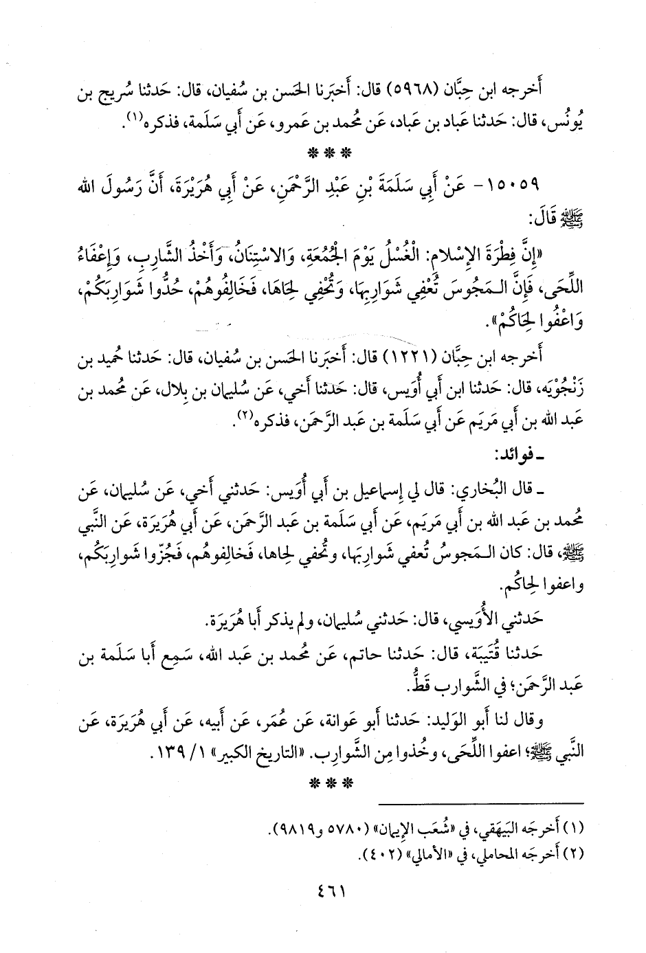 - وقال البخاري: قال لي إسماعيل بن أبي أويس: حدثني أخي، عن سليمان، عن محمد بن عبد الله بن أبي مريم، عن أبي سلمة بن عبد الرَّحمَن، عن أبي هريرة، عن النبي صَلى الله عَليه وسَلم قال: كان المجوس تعفي شواربها، وتحفي لحاها، فخالفوهم، فجزوا شواربكم، واعفوا لحاكم.