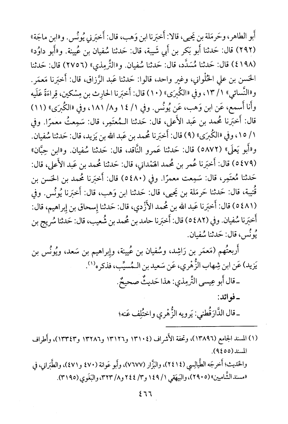 و «التِّرمِذي» (٢٧٥٦) قال: حدثنا الحسن بن علي الحُلْواني، وغير واحد، قالوا: حدثنا عبد الرزاق، قال: أخبرنا مَعمَر. و «النَّسَائي» ١/ ١٣، وفي «الكبرى» (١٠) قال: أخبرنا الحارث بن مسكين، قراءة عليه وأنا أسمع، عن ابن وهب، عن يونس. وفي ١/ ١٤ و ٨/ ١٨١، وفي «الكبرى» (١١) قال: أخبرنا محمد بن عبد الأعلى، قال: حدثنا المُعتَمِر، قال: سمعت معمرا. وفي ١/ ١٥، وفي «الكبرى» (٩) قال: أخبرنا محمد بن عبد الله بن يزيد، قال: حدثنا سفيان. و «أَبو يَعلى» (٥٨٧٢) قال: حدثنا عَمرو الناقد، قال: حدثنا سفيان. و «ابن حِبَّان» (٥٤٧٩) قال: أخبرنا عمر بن محمد الهمداني، قال: حدثنا محمد بن عبد الأعلى، قال: حدثنا معتمر، قال: سمعت معمرا. وفي (٥٤٨٠) قال: أخبرنا محمد بن الحسن بن قتيبة، قال: حدثنا حَرملة بن يحيى، قال: حدثنا ابن وهب، قال: أخبرنا يونس. وفي (٥٤٨١) قال: أخبرنا عبد الله بن محمد الأزدي، قال: حدثنا إسحاق بن إبراهيم، قال: أخبرنا سفيان. وفي (٥٤٨٢) قال: أخبرنا حامد بن محمد بن شعيب، قال: حدثنا سريج بن يونس، قال: حدثنا سفيان.