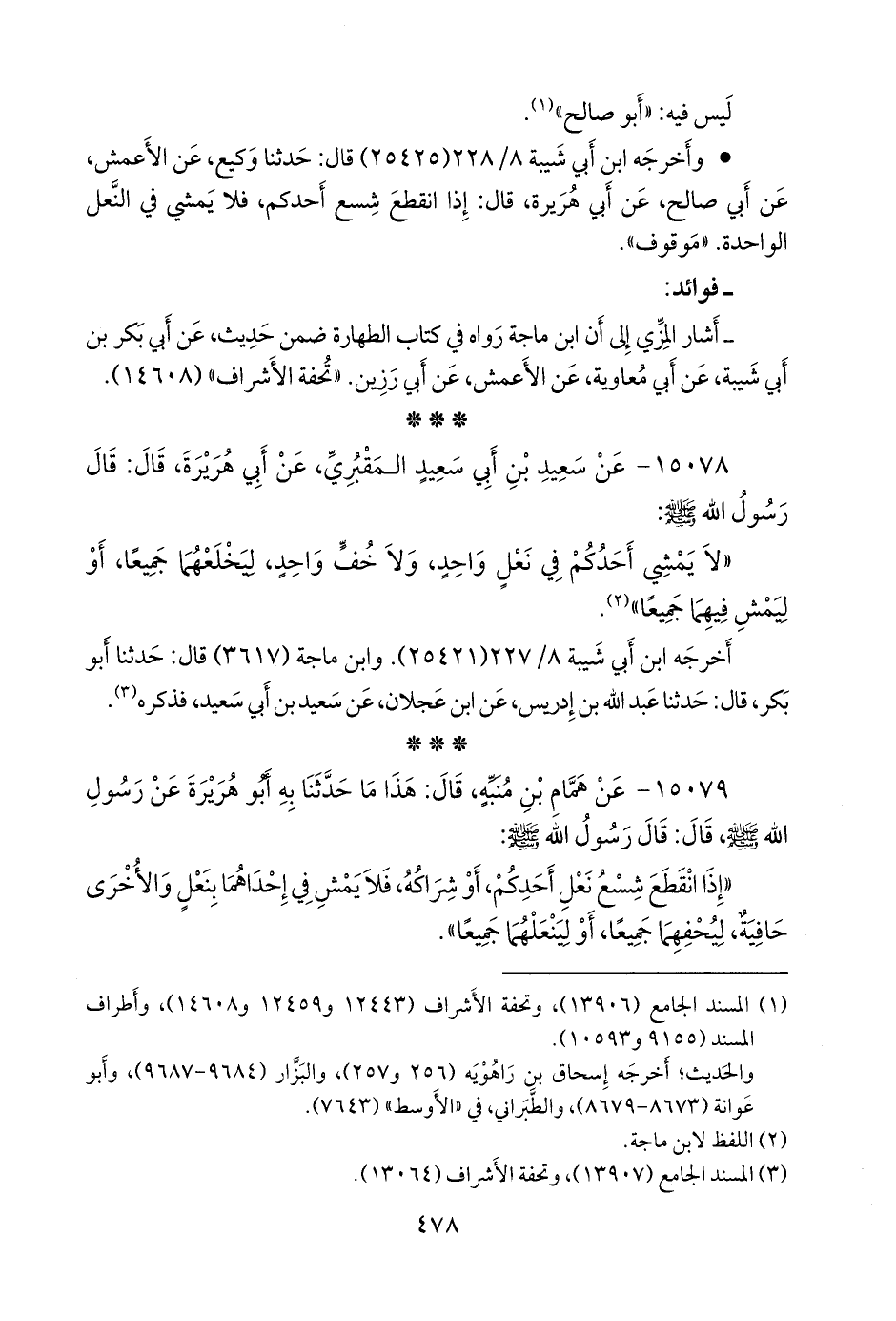 «إذا انقطع شسع نعل أحدكم، أو شراكه، فلا يمش في إحداهما بنعل والأخرى حافية، ليحفهما جميعا، أو لينعلهما جميعا».