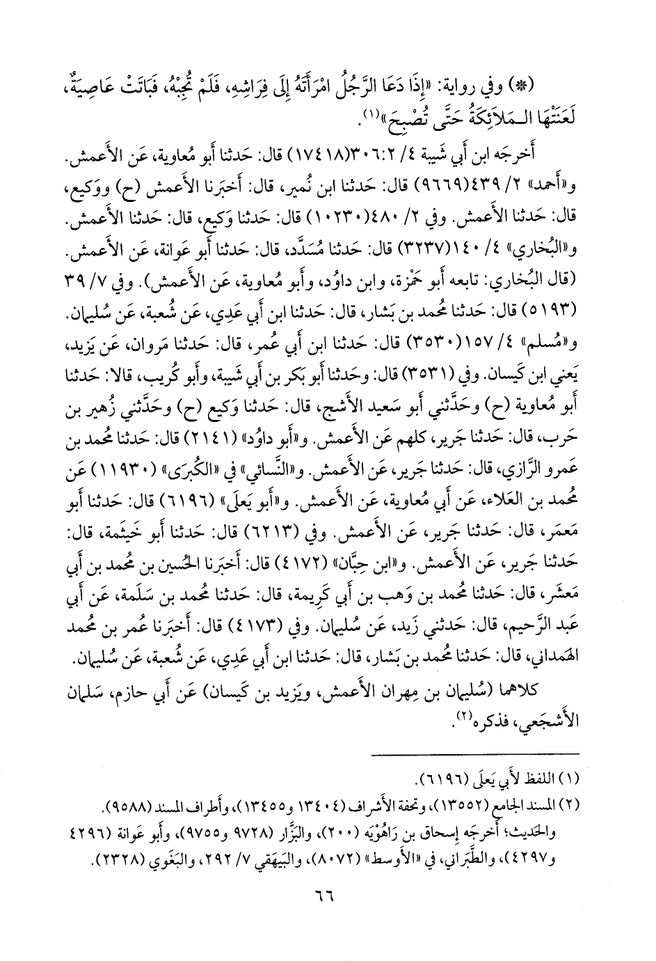 وفي ٧/ ٣٩ (٥١٩٣) قال: حدثنا محمد بن بشار، قال: حدثنا ابن أَبي عَدي، عن شعبة، عن سليمان. و «مسلم» ٤/ ١٥٧ (٣٥٣٠) قال: حدثنا ابن أبي عمر، قال: حدثنا مروان، عن يزيد، يعني ابن كَيْسان. وفي (٣٥٣١) قال: وحدثنا أَبو بكر بن أبي شيبة، وأَبو كُريب، قالا: حدثنا أَبو معاوية (ح) وحدثني أَبو سعيد الأشج، قال: حدثنا وكيع (ح) وحدثني زهير بن حرب، قال: حدثنا جرير، كلهم عن الأعمش. و «أَبو داود» (٢١٤١) قال: حدثنا محمد بن عَمرو الرازي، قال: حدثنا جرير، عن الأعمش. و «النَّسَائي» في «الكبرى» (١١٩٣٠) عن محمد بن العلاء، عن أبي معاوية، عن الأعمش. و «أَبو يَعلى» (٦١٩٦) قال: حدثنا أَبو مَعمَر، قال: حدثنا جرير، عن الأعمش. وفي (٦٢١٣) قال: حدثنا أَبو خيثمة، قال: حدثنا جرير، عن الأعمش. و «ابن حِبَّان» (٤١٧٢) قال: أخبرنا الحسين بن محمد بن أبي معشر، قال: حدثنا محمد بن وهب بن أبي كريمة، قال: حدثنا محمد بن سلمة، عن أبي عبد الرحيم، قال: حدثني زيد، عن سليمان. وفي (٤١٧٣) قال: أخبرنا عمر بن محمد الهمداني، قال: حدثنا محمد بن بشار، قال: حدثنا ابن أَبي عَدي، عن شعبة، عن سليمان.