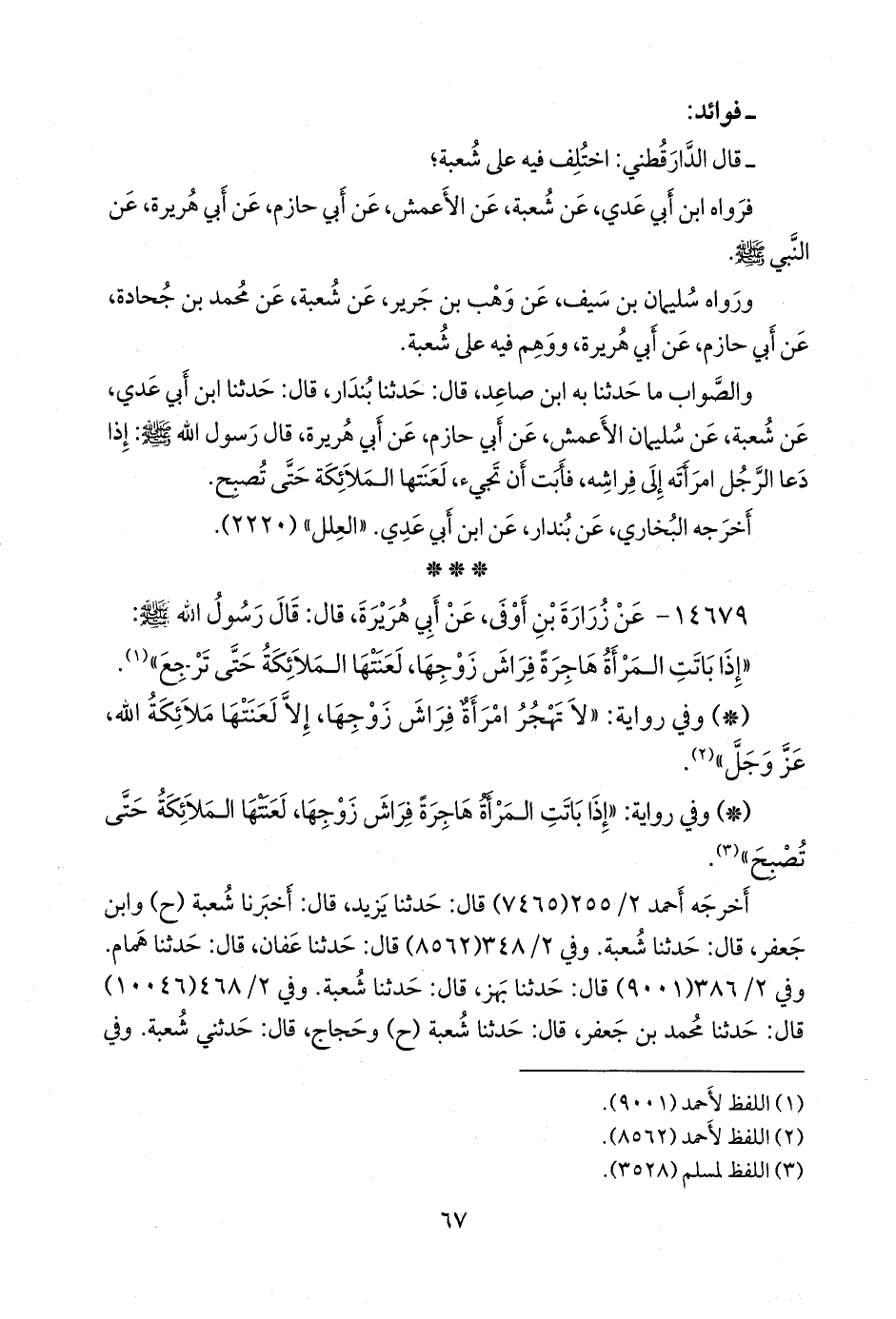 والصواب ما حدثنا به ابن صاعد، قال: حدثنا بندار، قال: حدثنا ابن أَبي عَدي، عن شعبة، عن سليمان الأعمش، عن أبي حازم، عن أبي هريرة، قال رسول الله صَلى الله عَليه وسَلم: إذا دعا الرجل امرأته إلى فراشه، فأبت أن تجيء، لعنتها الملائكة حتى تصبح.