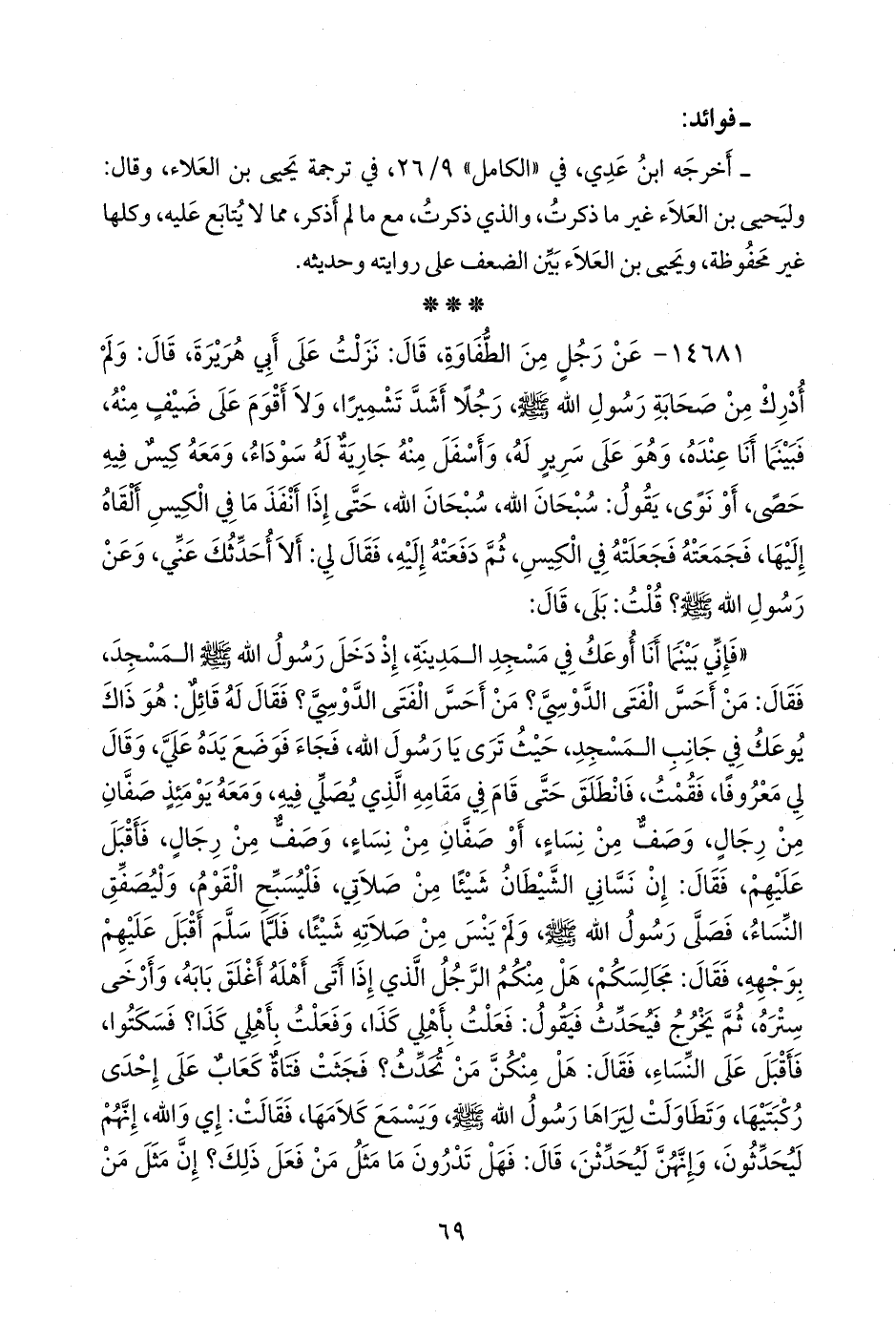 ١٤٦٨١ - عن رجل من الطفاوة، قال: نزلت على أبي هريرة، قال: ولم أدرك من صحابة رسول الله صَلى الله عَليه وسَلم رجلا أشد تشميرا، ولا أقوم على ضيف منه، فبينما أنا عنده، وهو على سرير له، وأسفل منه جارية له سوداء، ومعه كيس فيه حصى، أو نوى، يقول: سبحان الله، سبحان الله، حتى إذا أنفذ ما في الكيس ألقاه إليها، فجمعته فجعلته في الكيس، ثم دفعته إليه، فقال لي: ألا أحدثك عني، وعن رسول الله صَلى الله عَليه وسَلم؟ قلت: بلى، قال: