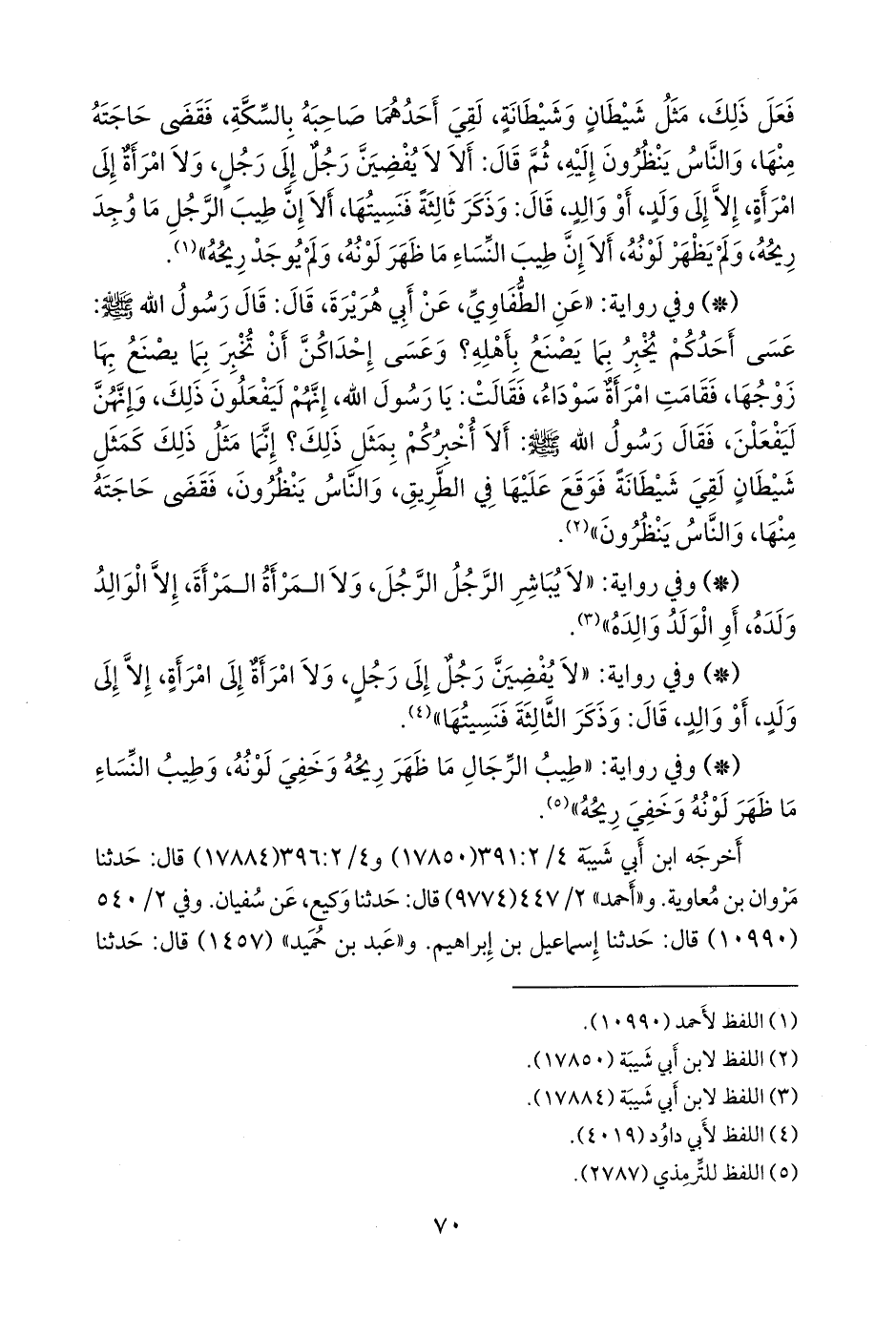 - وفي رواية: «عن الطفاوي, عن أبي هريرة، قال: قال رسول الله صَلى الله عَليه وسَلم: عسى أحدكم يخبر بما يصنع بأهله؟ وعسى إحداكن أن تخبر بما يصنع بها زوجها، فقامت امرأة سوداء, فقالت: يا رسول الله، إنهم ليفعلون ذلك، وإنهن ليفعلن، فقال رسول الله صَلى الله عَليه وسَلم: ألا أخبركم بمثل ذلك؟ إنما مثل ذلك كمثل شيطان لقي شيطانة فوقع عليها في الطريق، والناس ينظرون، فقضى حاجته منها، والناس ينظرون» (¬١).