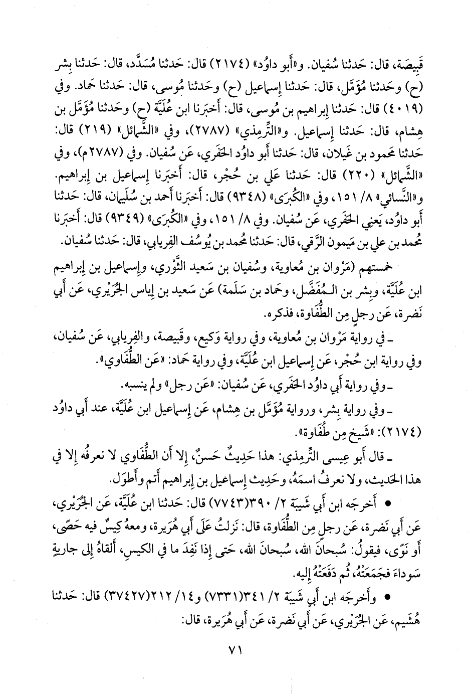 - في رواية مروان بن معاوية، وفي رواية وكيع، وقَبيصَة، والفريابي، عن سفيان، وفي رواية ابن حجر، عن إسماعيل ابن عُلَية، وفي رواية حماد: «عن الطفاوي».