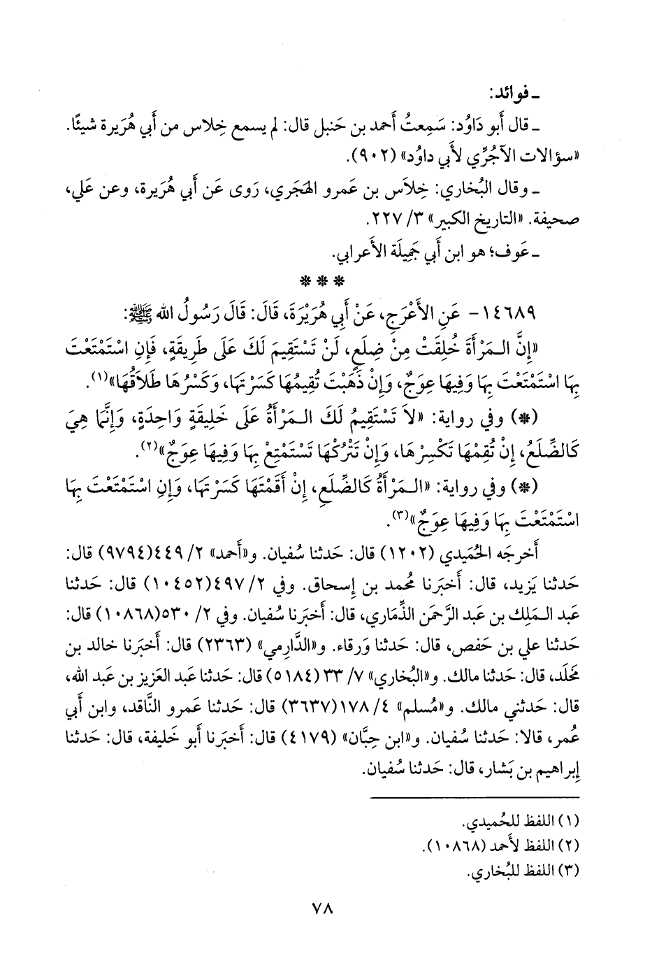 - وفي رواية: «المرأة كالضلع، إن أقمتها كسرتها، وإن استمتعت بها استمتعت بها وفيها عوج» (¬٣).