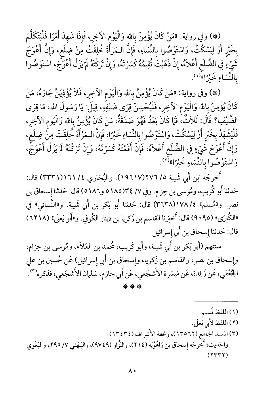 - وفي رواية: «من كان يؤمن بالله واليوم الآخر، فلا يؤذين جاره، من كان يؤمن بالله واليوم الآخر، فليحسن قرى ضيفه، قيل: يا رسول الله، ما قرى الضيف؟ قال: ثلاث، فما كان بعد فهو صدقة، من كان يؤمن بالله واليوم الآخر، فليشهد بخير أو ليسكت، واستوصوا بالنساء خيرا، فإن المرأة خلقت من ضلع، وإن أعوج شيء في الضلع أعلاه، فإن أقمته كسرته، وإن تركته لم يزل أعوج، واستوصوا بالنساء خيرا» (¬١).