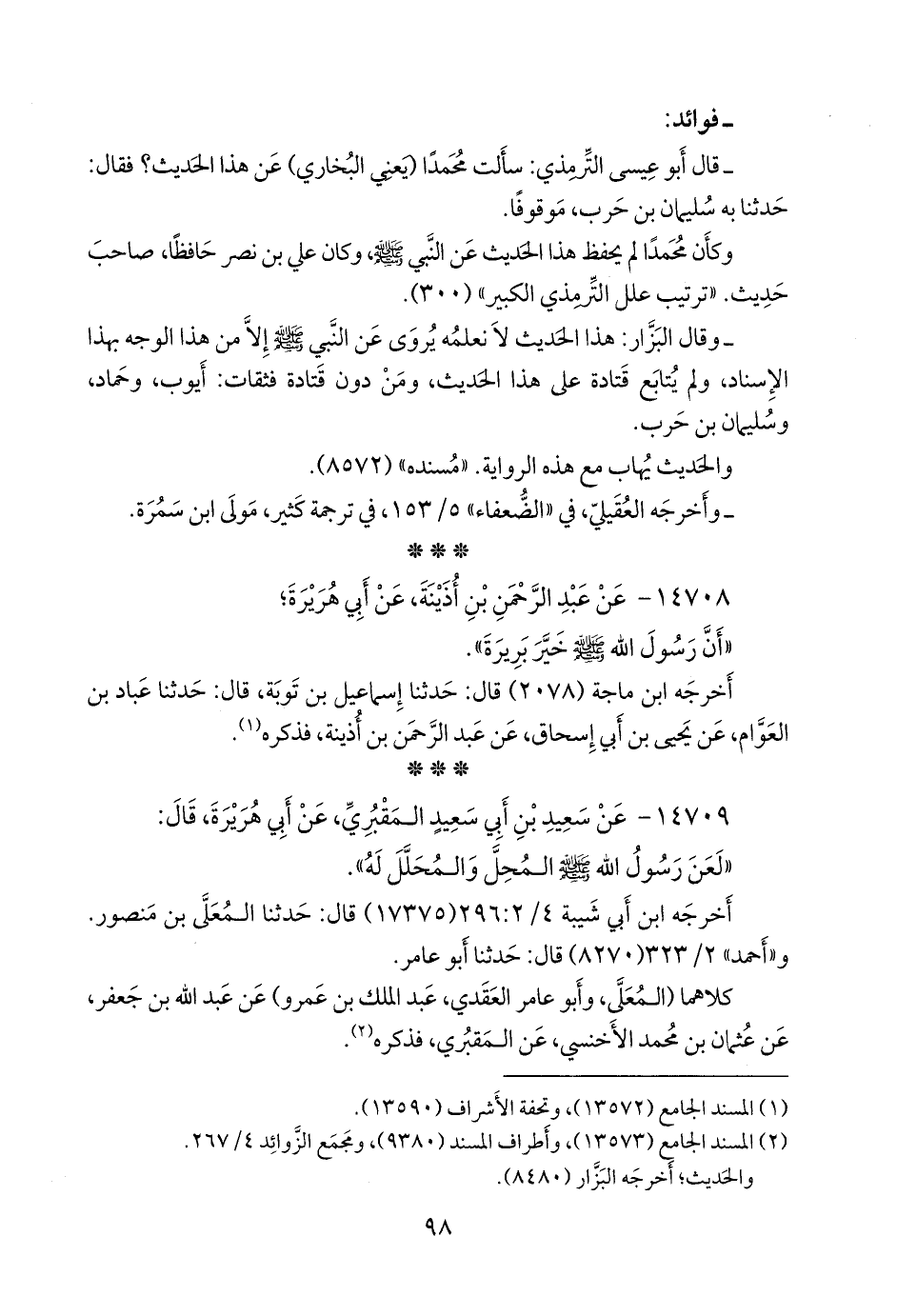 - وقال البزار: هذا الحديث لا نعلمه يروى عن النبي صَلى الله عَليه وسَلم إلا من هذا الوجه بهذا الإسناد، ولم يتابع قتادة على هذا الحديث، ومن دون قتادة فثقات: أيوب، وحماد، وسليمان بن حرب.