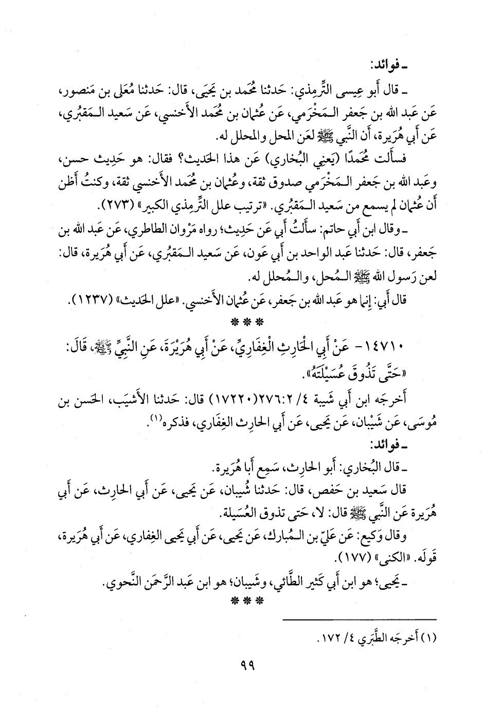 - قال التِّرمِذي: حدثنا محمد بن يحيى، قال: حدثنا مُعَلى بن منصور، عن عبد الله بن جعفر المخرمي، عن عثمان بن محمد الأخنسي، عن سعيد المَقبُري، عن أبي هريرة، أن النبي صَلى الله عَليه وسَلم لعن المحل والمحلل له.