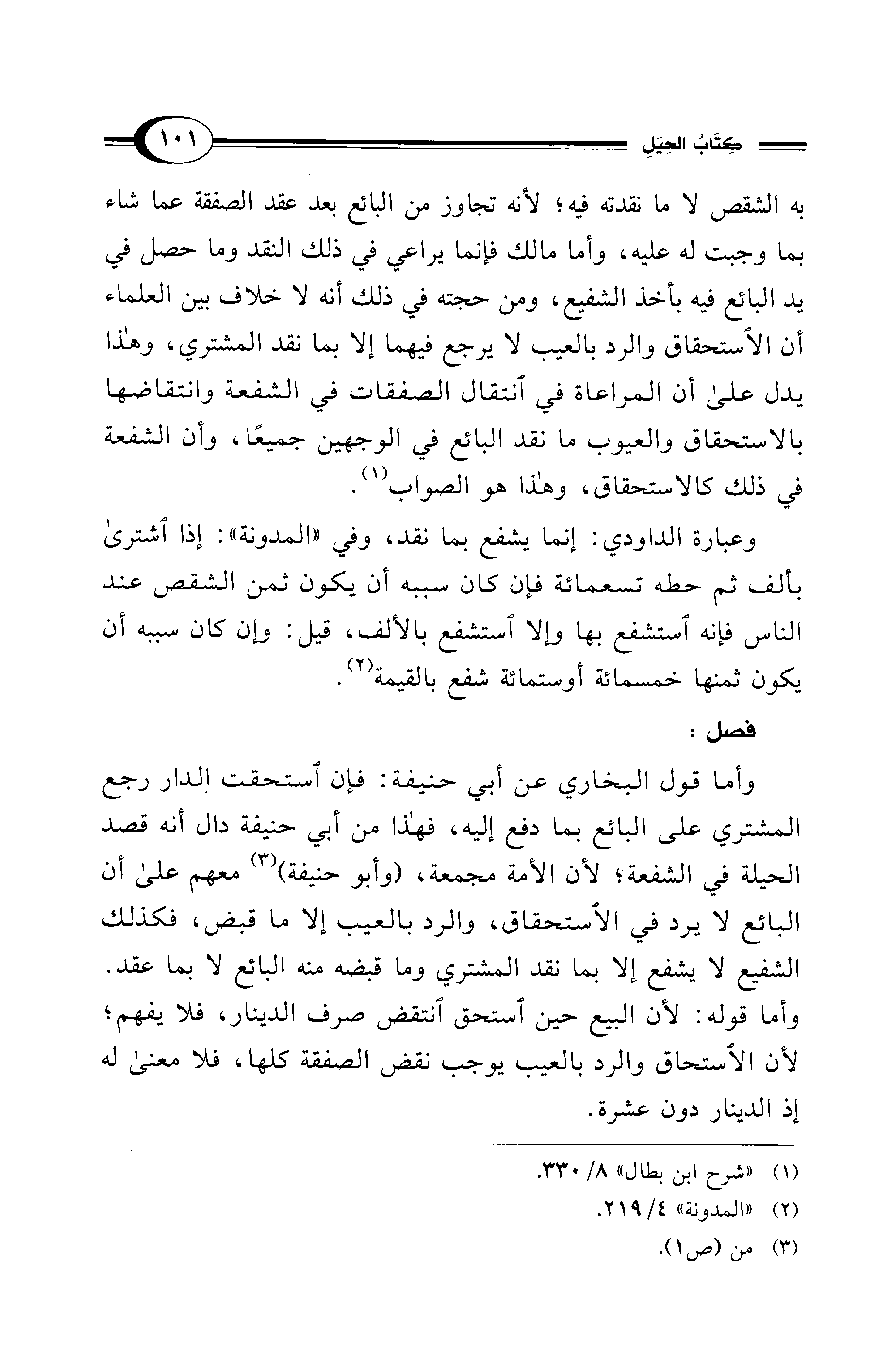 وأما قول البخاري عن أبي حنيفة: فإن استحقت الدار رجع المشتري على البائع بما دفع إليه، فهذا من أبي حنيفة دال أنه قصد الحيلة في الشفعة؛ لأن الأمة مجمعة، (وأبو حنيفة) (¬3) معهم على أن البائع لا يرد في الاستحقاق، والرد بالعيب إلا ما قبض، فكذلك الشفيع لا يشفع إلا بما نقد المشتري وما قبضه منه البائع لا بما عقد. وأما قوله: لأن البيع حين استحق انتقض صرف الدينار، فلا يفهم؛ لأن الاستحاق والرد بالعيب يوجب نقض الصفقة كلها، فلا معنى له إذ الدينار دون عشرة.