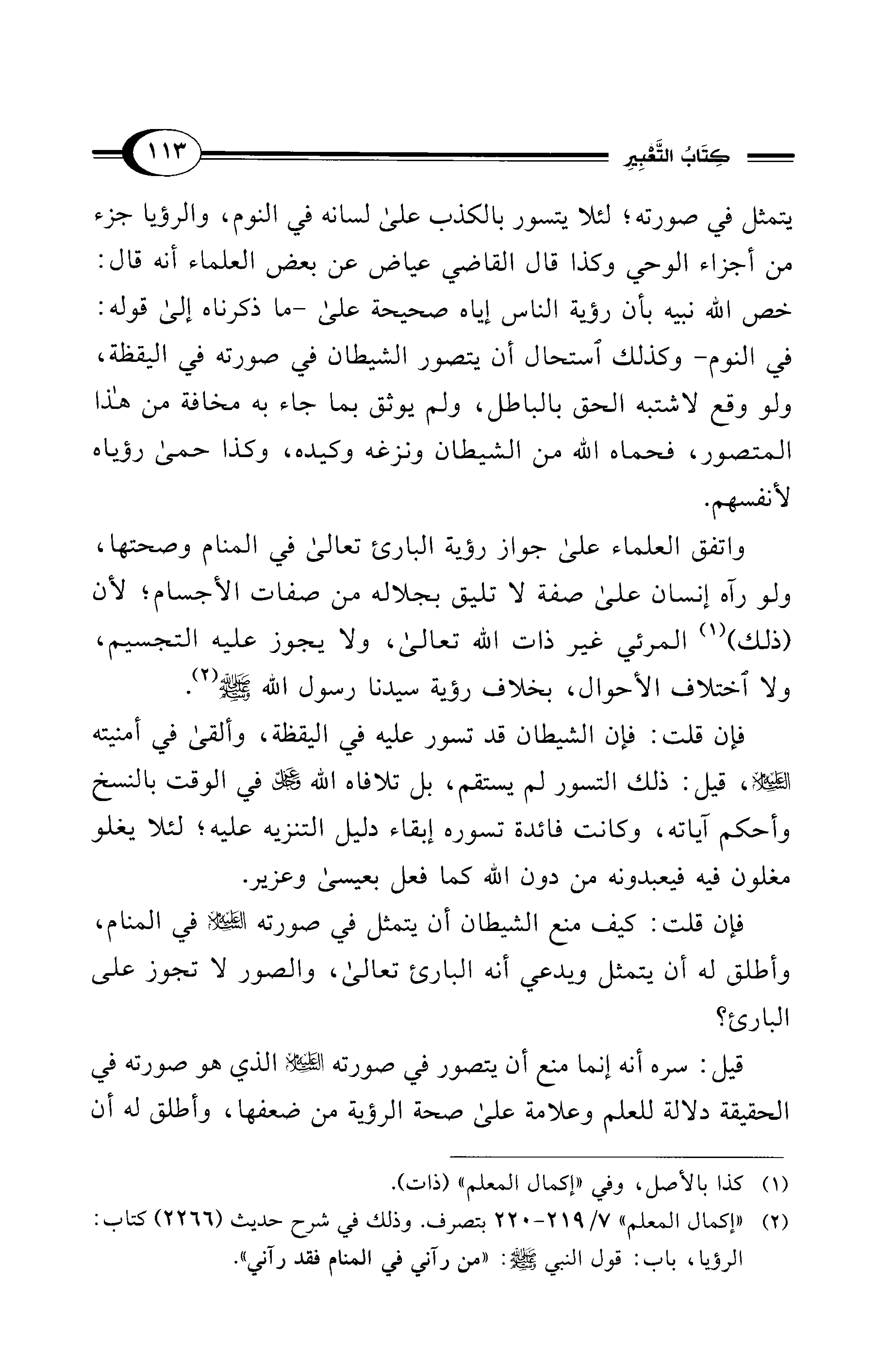 (¬2) "إكمال المعلم" 7/ 219 - 220 بتصرف. وذلك في شرح حديث (2266) كتاب: الرؤيا، باب: قول النبي - صلى الله عليه وسلم -: "من رآني في المنام فقد رآني".