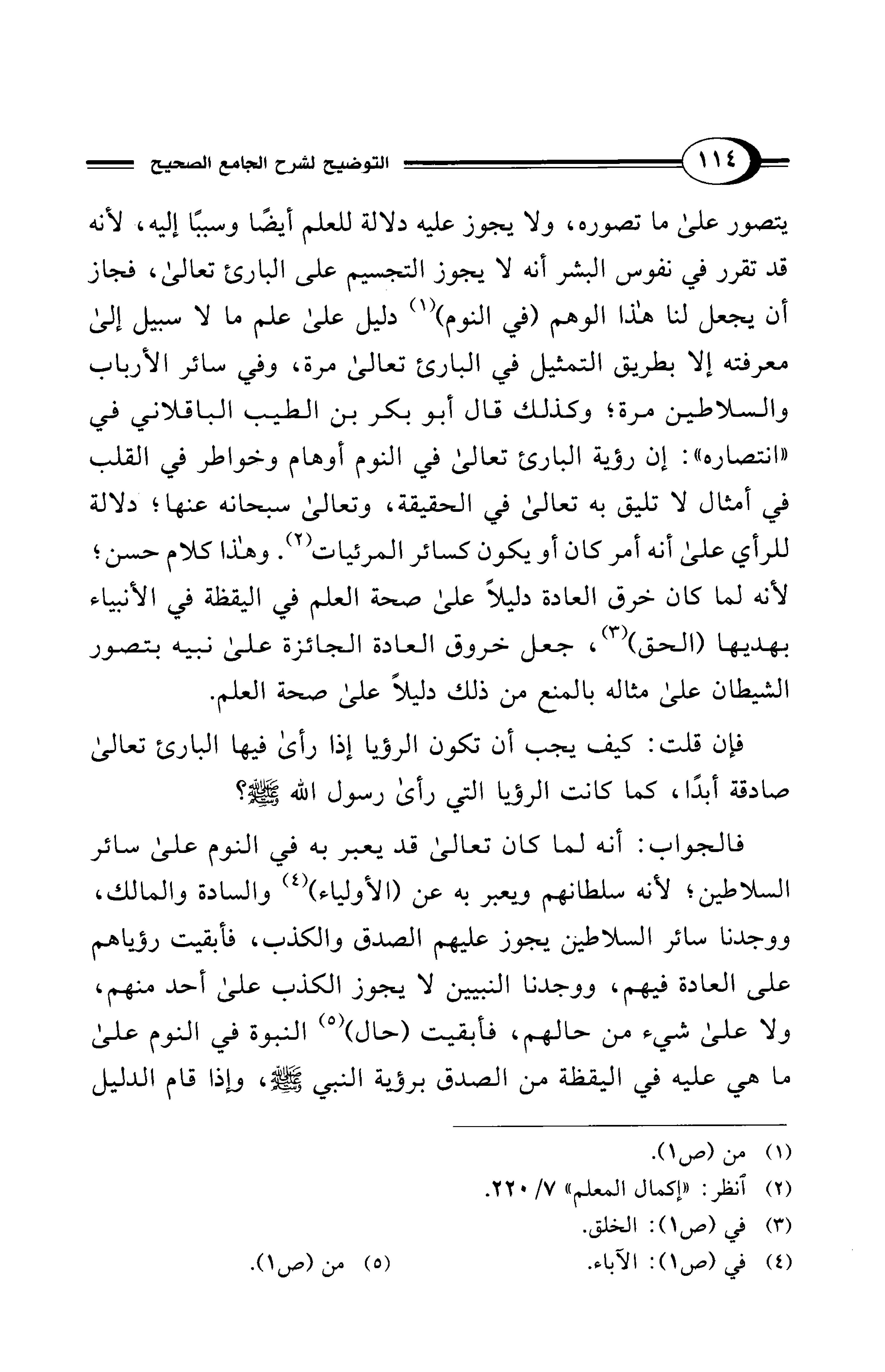 يتصور على ما تصوره، ولا يجوز عليه دلالة للعلم أيضًا وسببًا إليه, لأنه قد تقرر في نفوس البشر أنه لا يجوز التجسيم على البارئ تعالى، فجاز أن يجعل لنا هذا الوهم (في النوم) (¬1) دليل على علم ما لا سبيل إلى معرفته إلا بطريق التمثيل في البارئ تعالى مرة، وفي سائر الأرباب والسلاطين مرة؛ وكذلك قال أبو بكر بن الطيب الباقلاني في "انتصاره": إن رؤية البارئ تعالى في النوم أوهام وخواطر في القلب في أمثال لا تليق به تعالى في الحقيقة، وتعالى سبحانه عنها؛ دلالة للرأي على أنه أمر كان أو يكون كسائر المرئيات (¬2). وهذا كلام حسن؛ لأنه لما كان خرق العادة دليلاً على صحة العلم في اليقظة في الأنبياء بهديها (الحق) (¬3)، جعل خروق العادة الجائزة على نبيه بتصور الشيطان على مثاله بالمنع من ذلك دليلاً على صحة العلم.